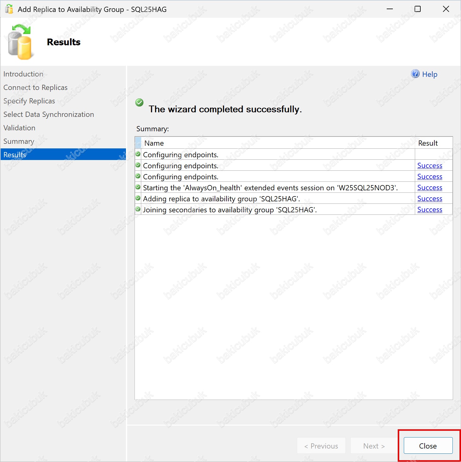 Availability Group yapısına W25SQL25NOD3 isimli sunucunun eklenme işlemi sorunsuz şekilde tamamlandıktan sonra, Close seçeneğine tıklayarak Add Replica to Availability Group – SQL25HAG Wizard ekranını kapatıyoruz.