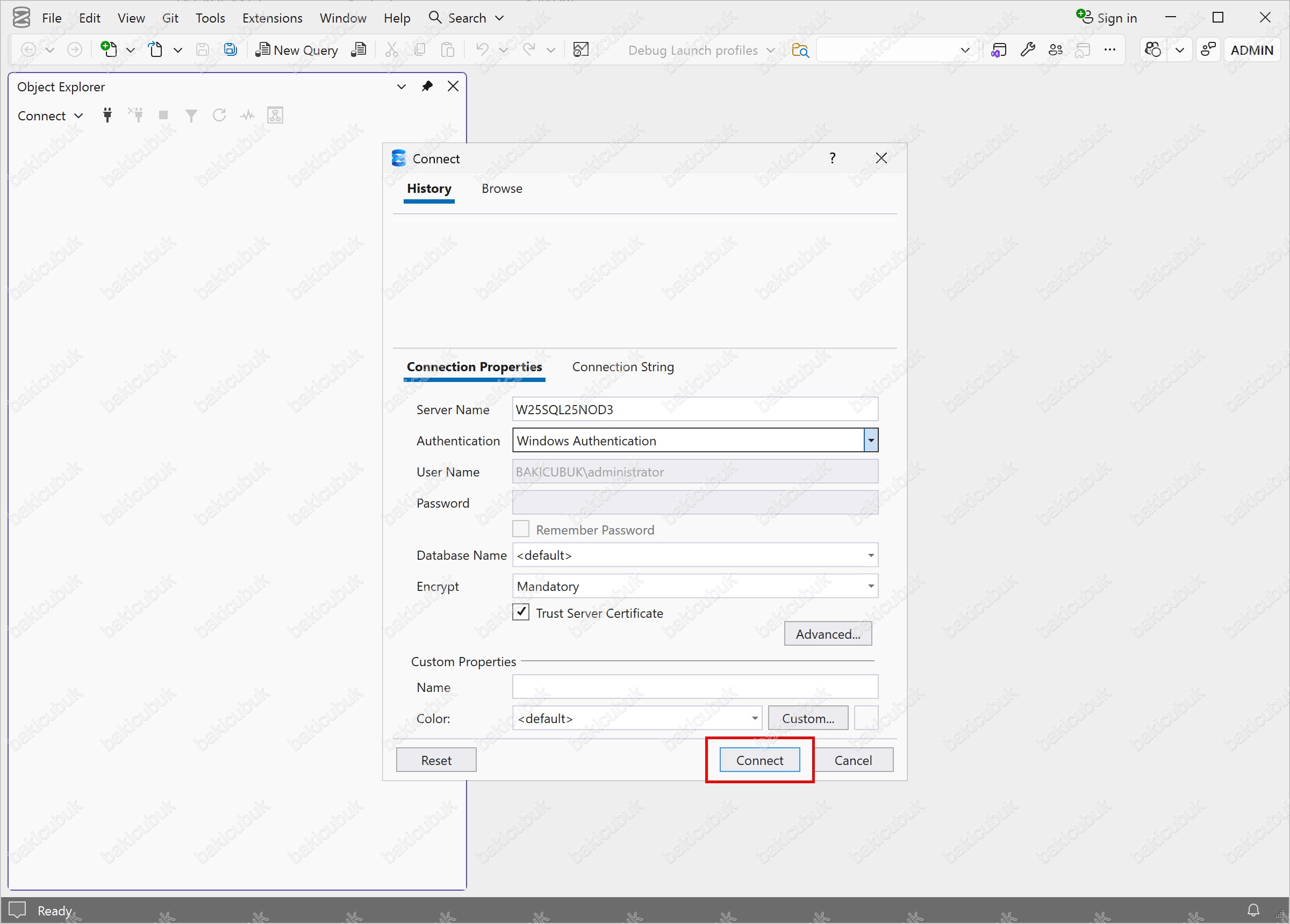 Connect seçeneği ile W25SQL25NOD3 isimli sunucumuza bağlantı sağlıyoruz.