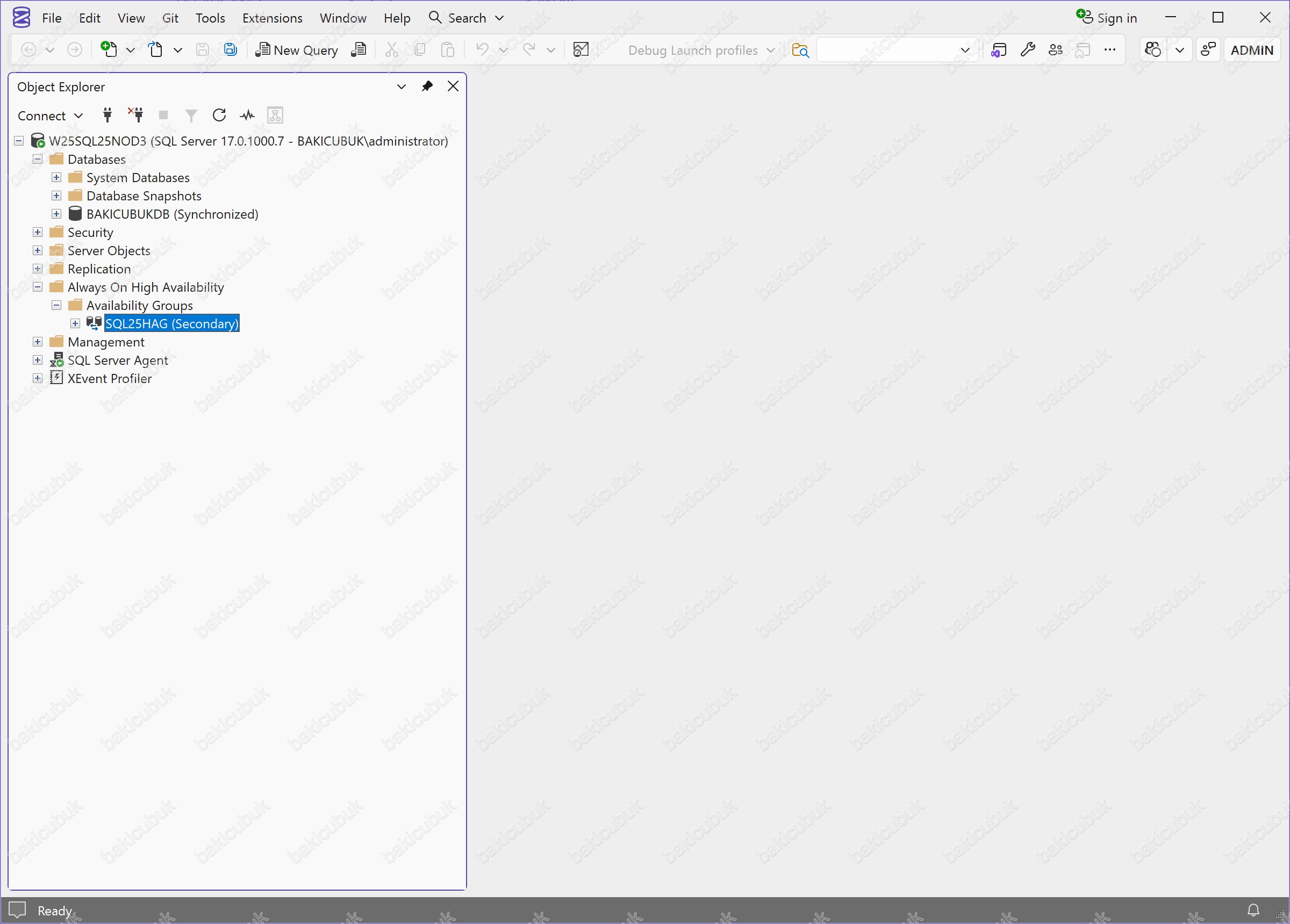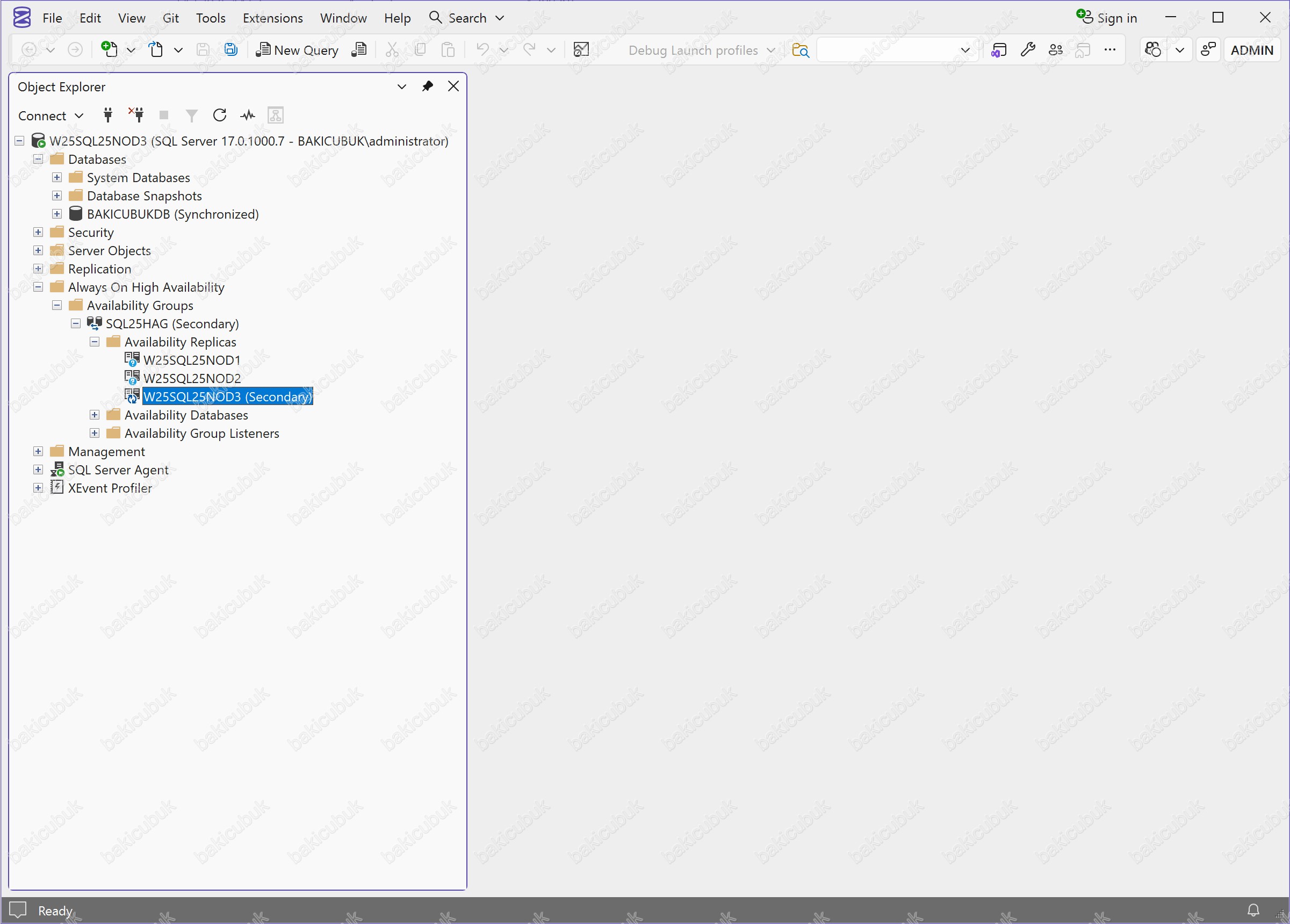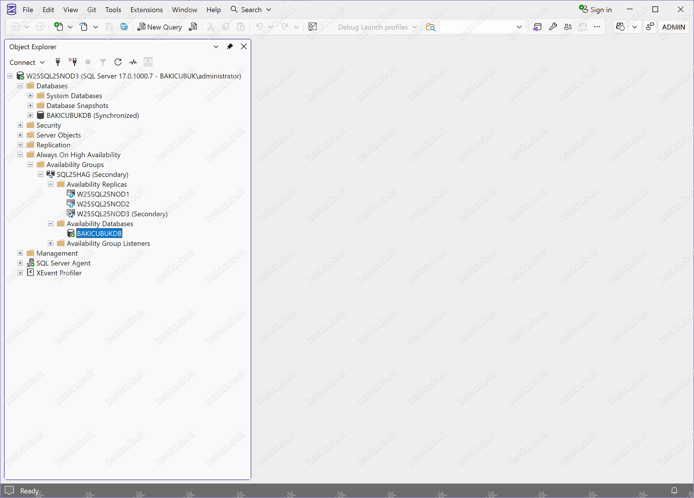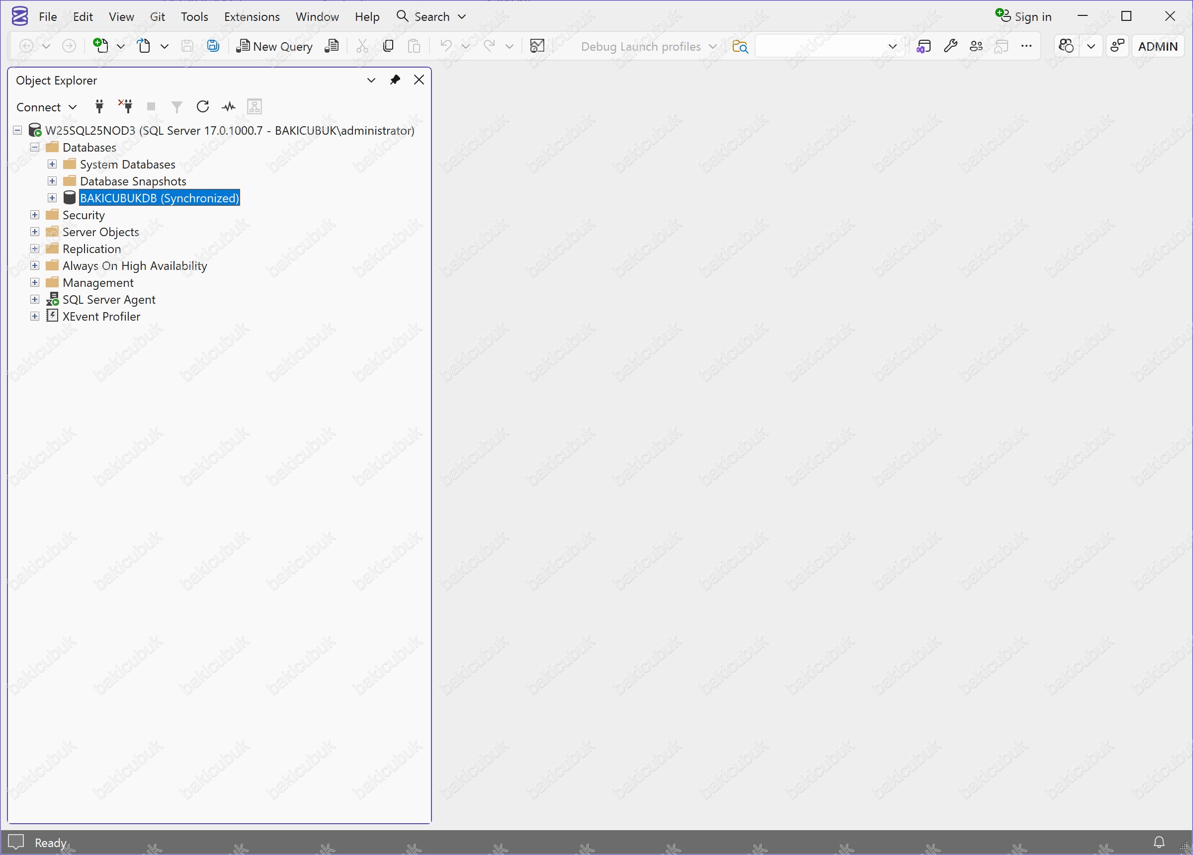 Microsoft SQL Server Management Studio (SSMS) konsolunda Databases bölümü altında BAKICUBUKDB isimli veritabanının BAKICUBUKDB (Synchronized) durumunda olduğunu görüyoruz. Bu ifade, veritabanının Always On Availability Group kapsamında Primary Replica (Node) ve Secondary Replica (Node) arasında senkronize çalıştığını ve yapının sağlıklı olduğunu gösterir.