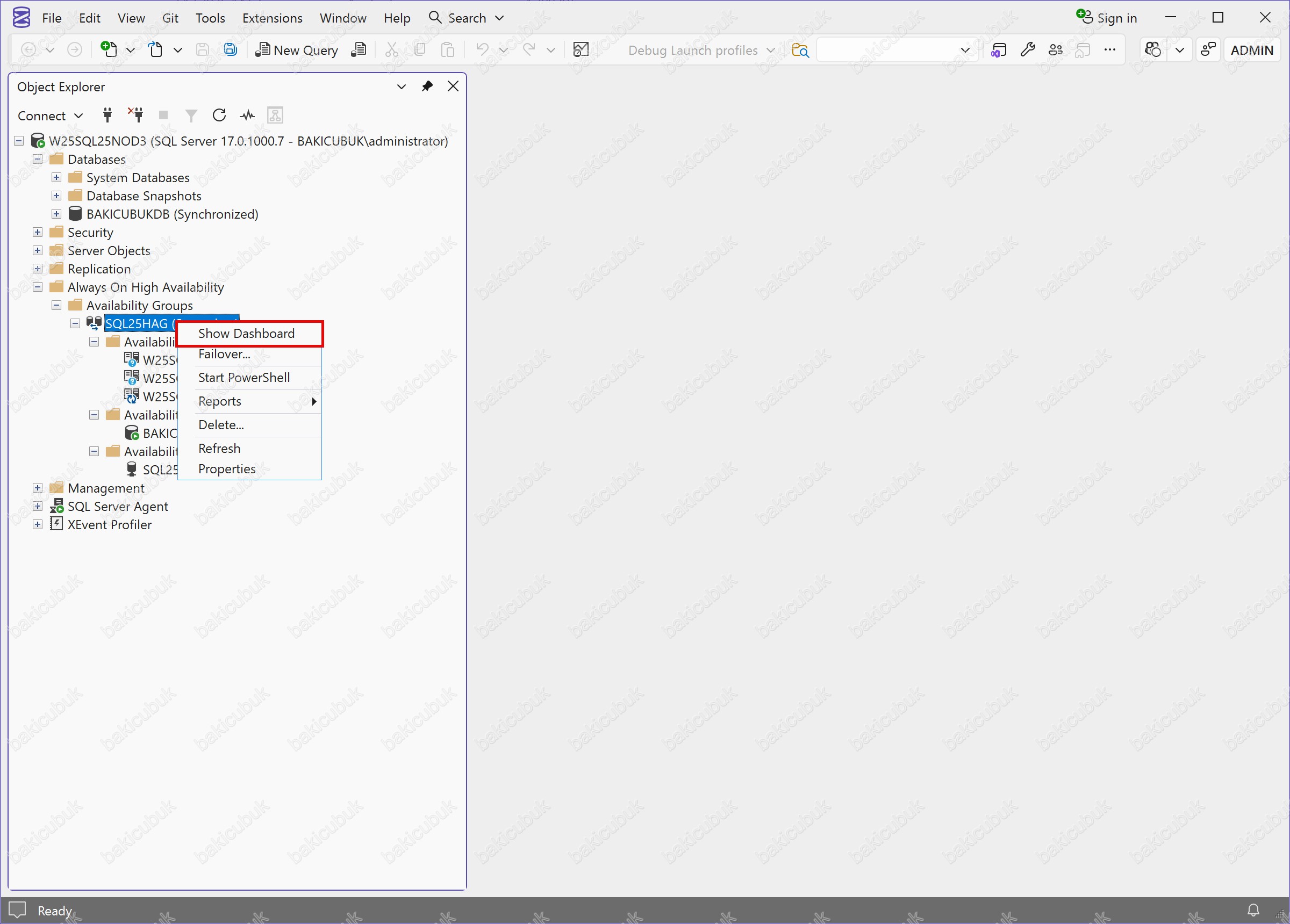 Microsoft SQL Server Management Studio (SSMS) konsolunda Always On High Availability bölümü altında yer alan Availability Groups kısmında SQL25HAG ismiyle yapılandırmış olduğumuz Availability Group üzerinde sağ tuşa tıklayarak Show Dashboard seçeneğini seçiyoruz.