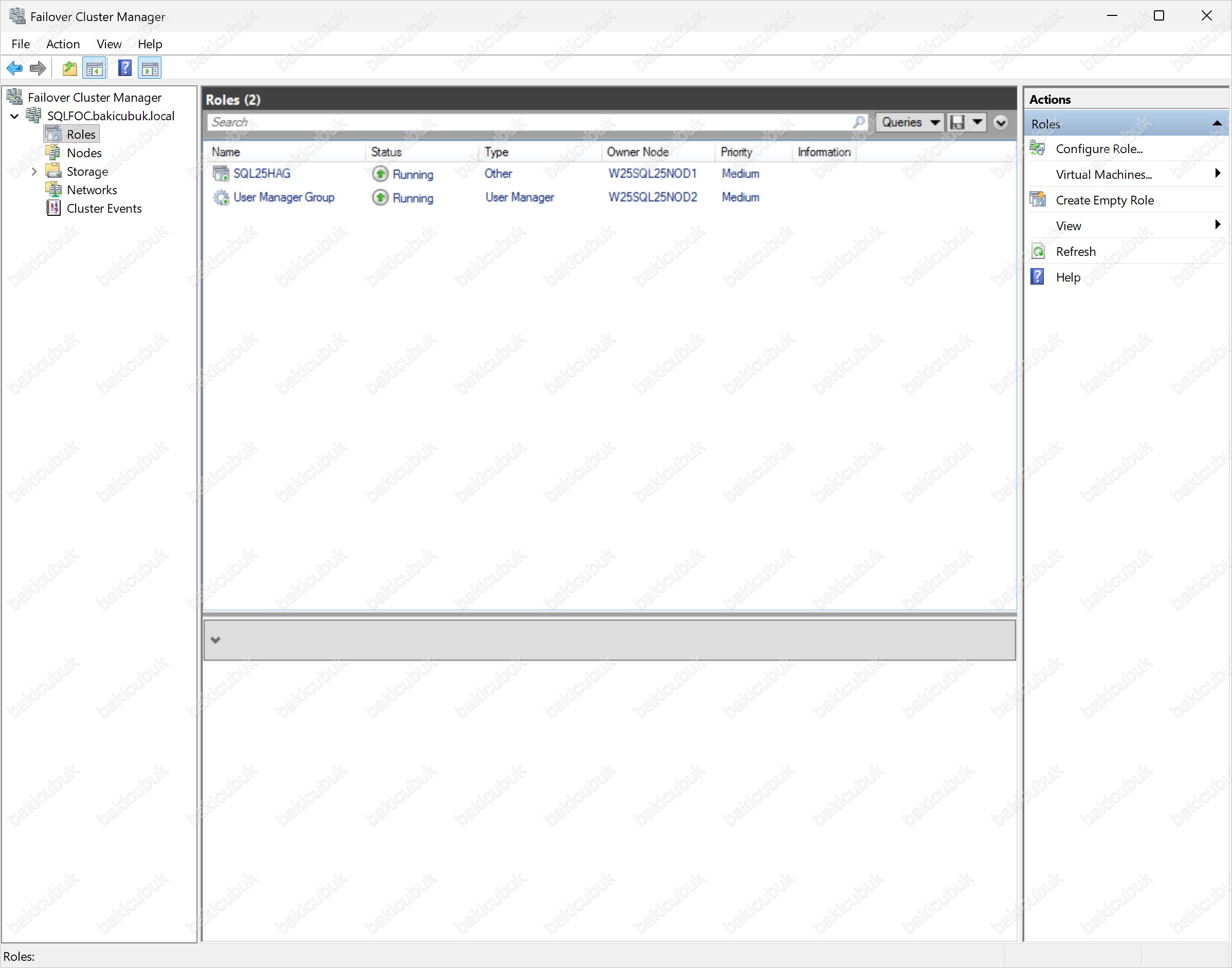 Failover Cluster Manager konsolunda, Roles (Roller) menüsü altında SQL25HAG ismi ile yapılandırmış olduğumuz Availability Group yapısının başarıyla oluşturulduğunu ve Cluster rolü olarak eklendiğini görüyoruz.