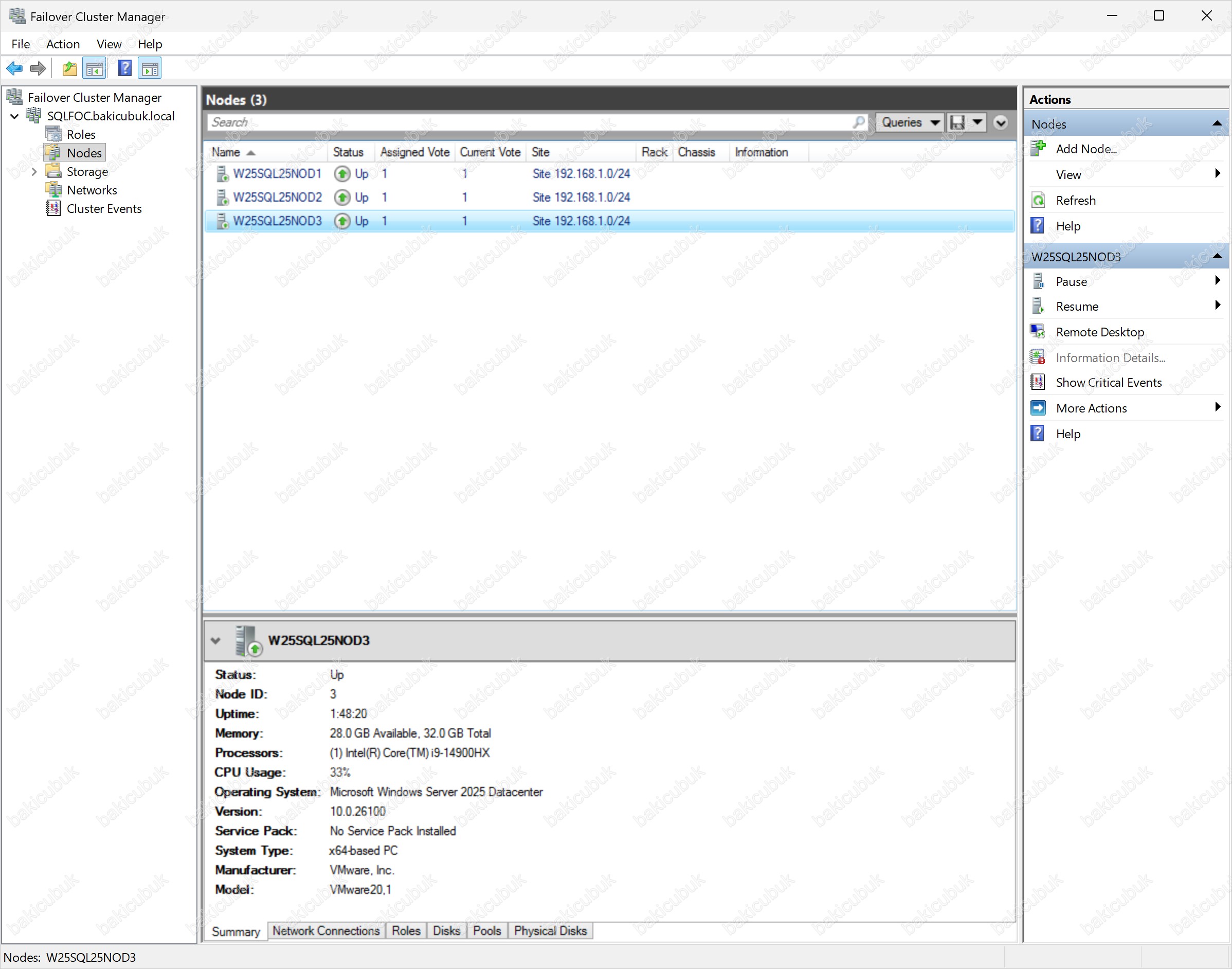 W25SQL25NOD3 isimli Windows Server 2025 sunucumuz üzerinde Windows Server Failover Cluster (WSFC) yapısının kurulum ve yapılandırma adımlarını başarıyla tamamladık. Bu yapı, High Availability (Yüksek Erişilebilirlik) ve Disaster Recovery (Felaket Kurtarma) senaryolarının temelini oluşturan kritik bir altyapı bileşenidir.