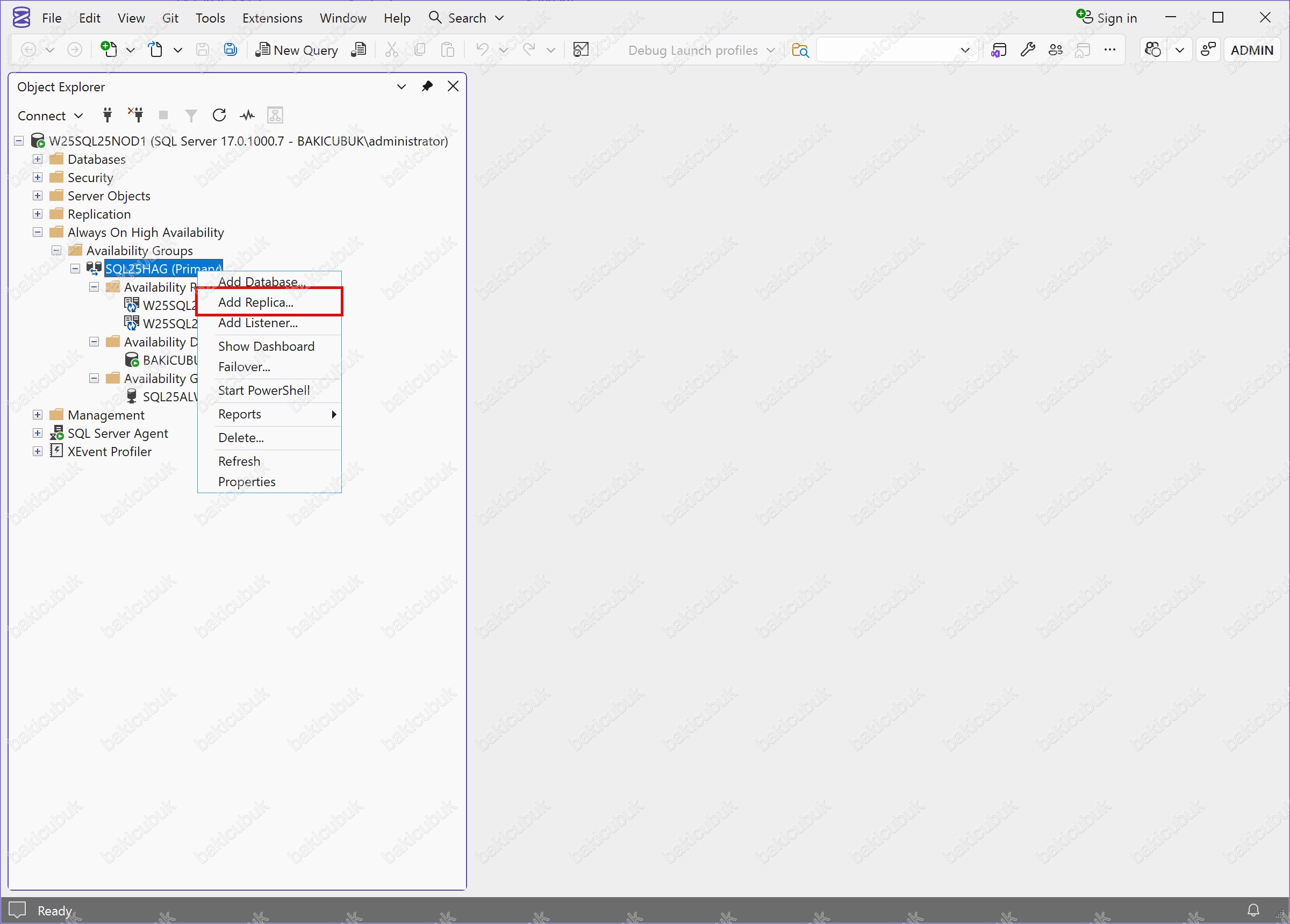 Mevcut SQL25HAG Availability Group yapısına yeni bir Secondary Replica (Node) eklemek amacıyla, ilgili Availability Group üzerinde sağ tuş tıklıyoruz ve açılan menüden Add Replica seçeneğini seçiyoruz.
