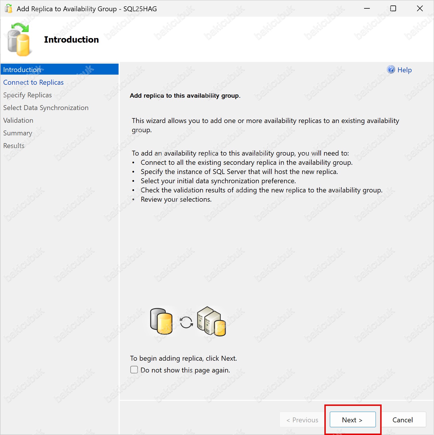 Introduction ekranında gerekli kontrolleri ve açıklamaları inceledikten sonra Next seçeneğine tıklayarak sihirbazın Connect to Replicas adımına geçiyoruz.