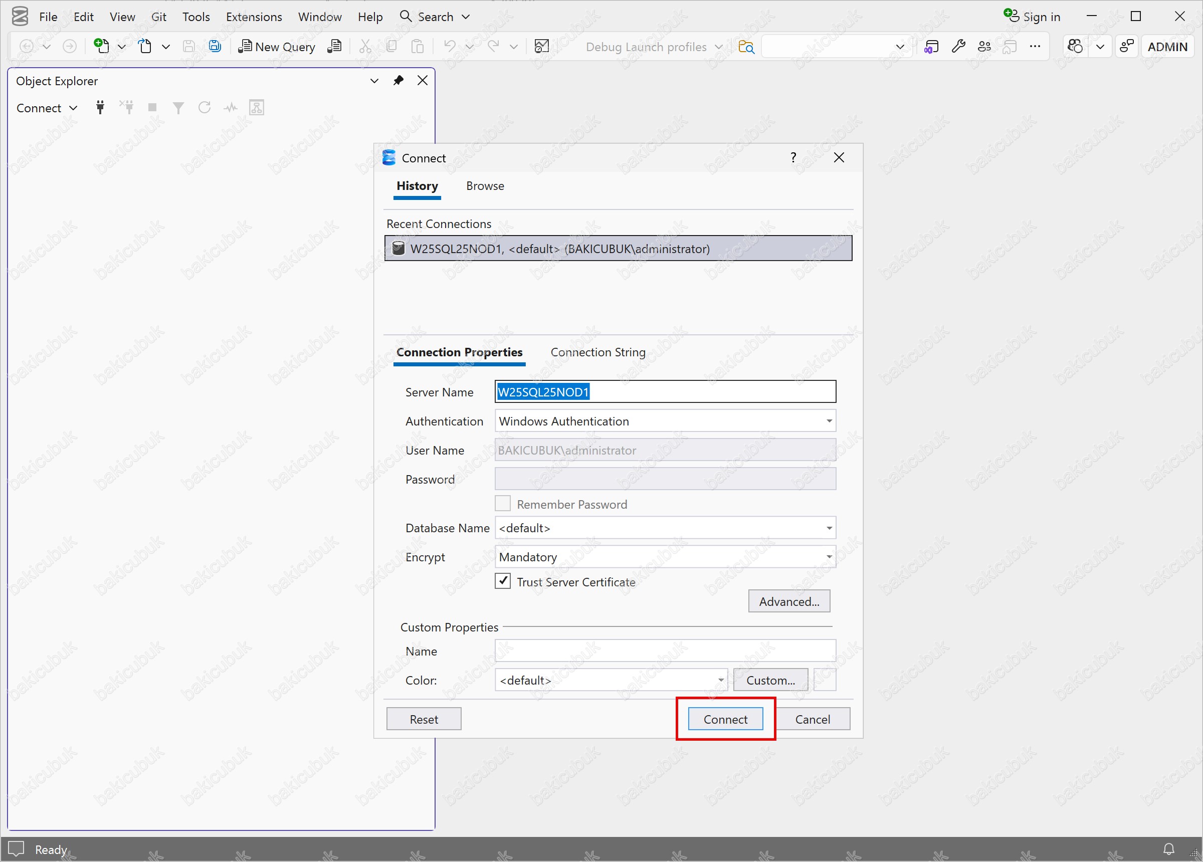 Connect seçeneği ile W25SQL25NOD1 isimli sunucumuza bağlantı sağlıyoruz.