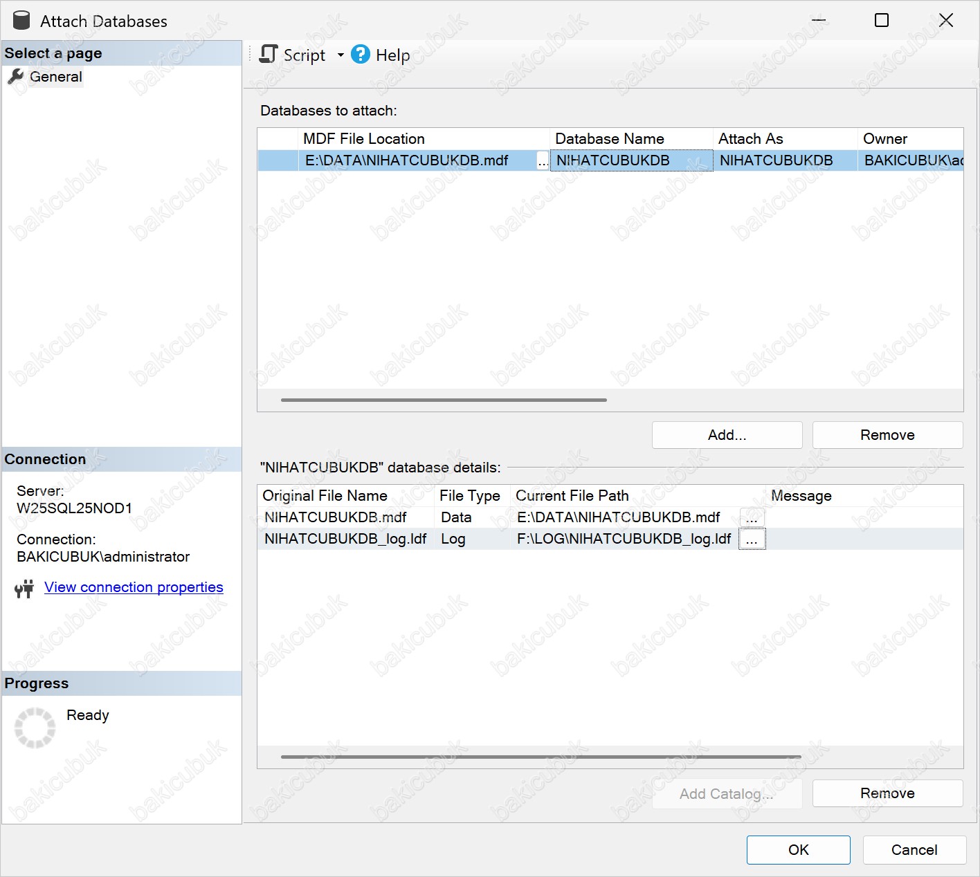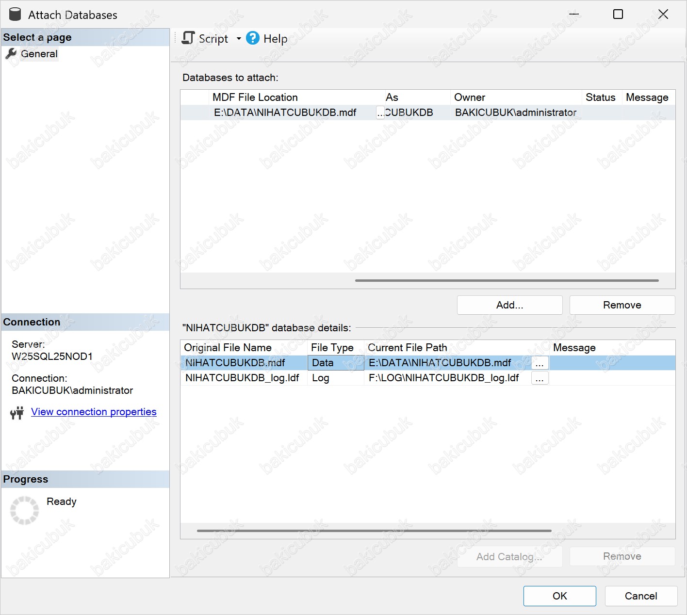 Attach Databases ekranında General sekmesine baktığımızda, Original File Name bölümü altında NIHATCUBUKDB_log.ldf isimli SQL Server Database Transaction Log File (.ldf) dosyasının bulunduğu için herhangi bir hata görmüyoruz. Eğer NIHATCUBUKDB_log.ldf isimli SQL Server Database Transaction Log File (.ldf) dosyasını dizininde bulunmasaydı Message bölümünde ilgili dosyanın eksik olduğuna dair bir hata mesajı görüntülenir.
