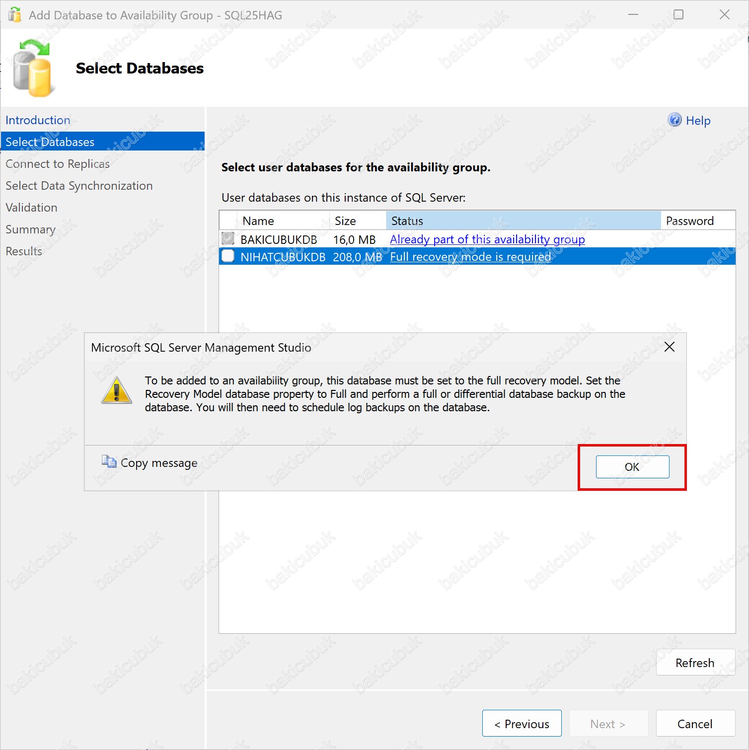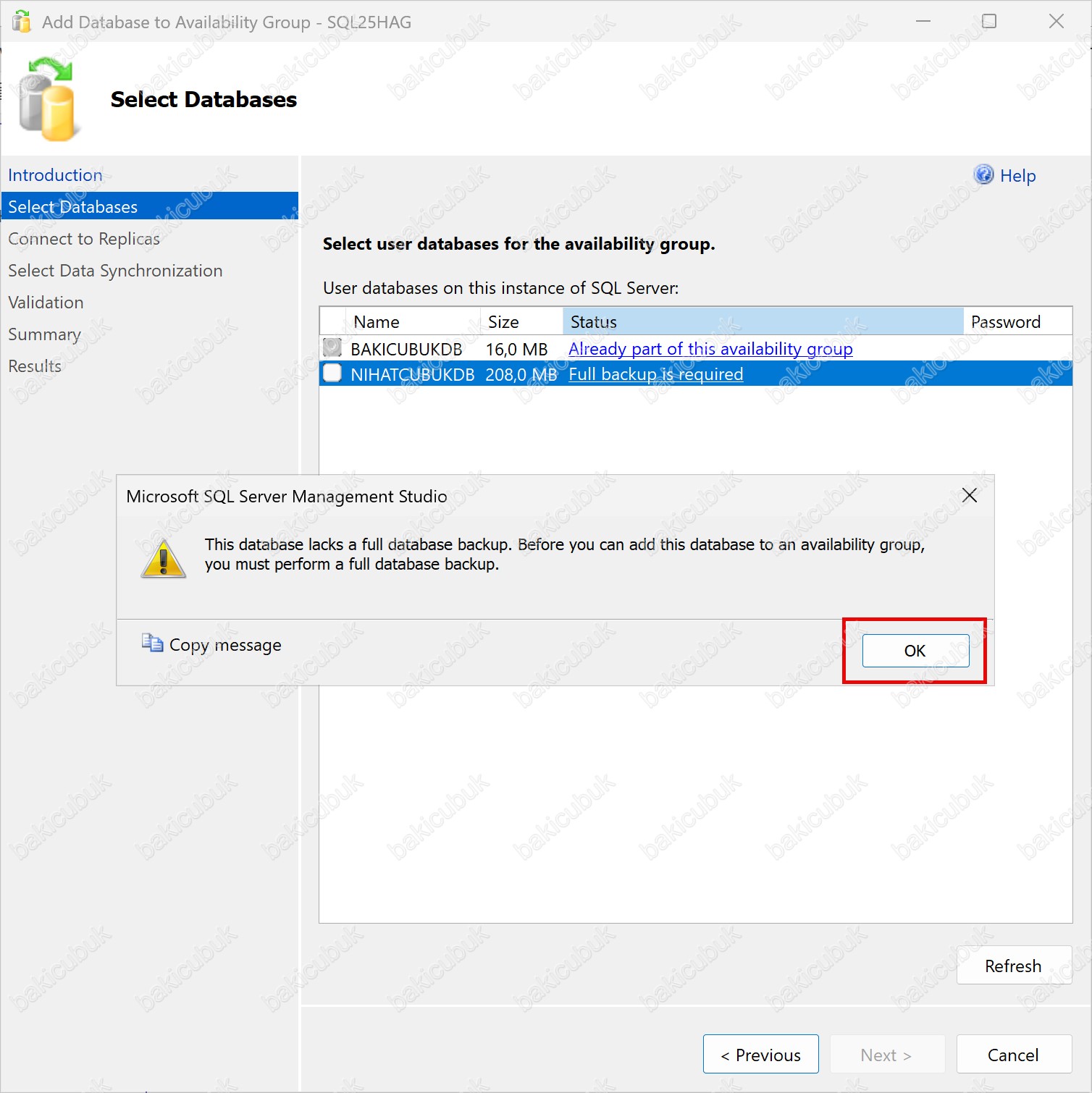 Ekranda açılan uyarı penceresinde de belirtildiği üzere, This database lacks a full database backup mesajı, veritabanının henüz tam yedeğinin alınmadığını açıkça belirtir. Bu nedenle NIHATCUBUKDB isimli Database (Veritabanı) seçilemez ve Availability Group’a ekleme işlemi devam ettirilemez.