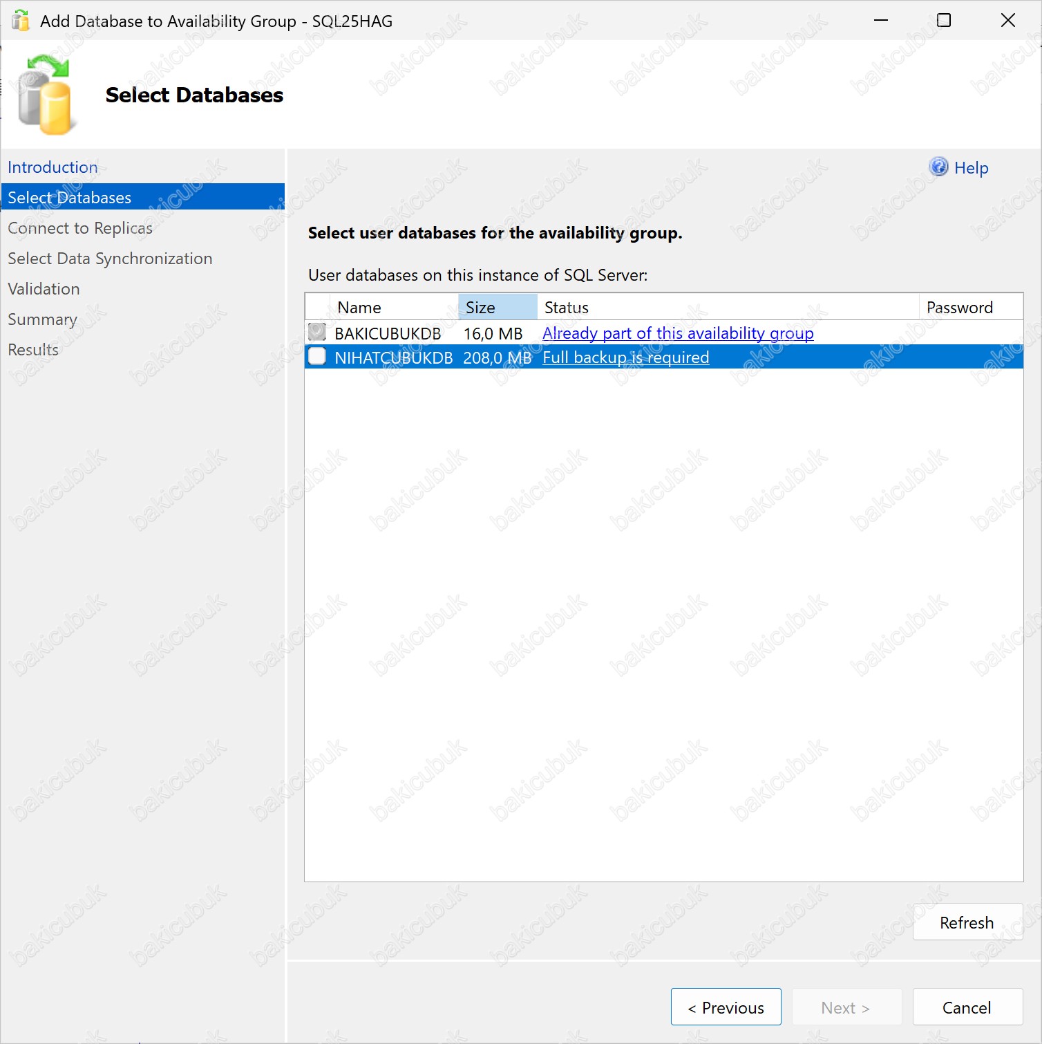 Eğer NIHATCUBUKDB isimli Database (Veritabanı)’i üzerinde Full Backup alınmazsa, New Availability Group Wizard içerisindeki Select Databases ekranında ilgili veritabanının Status bölümünde Full backup is required hatası ile karşılaşılır. Bu hata nedeniyle veritabanı seçilemez ve Availability Group’a ekleme işlemi gerçekleştirilemez.
