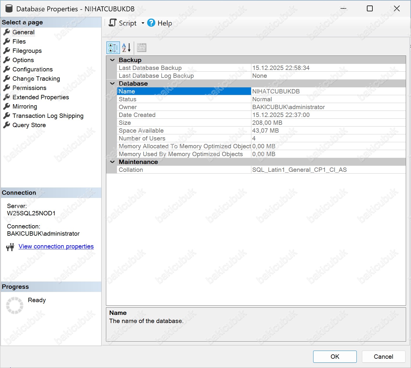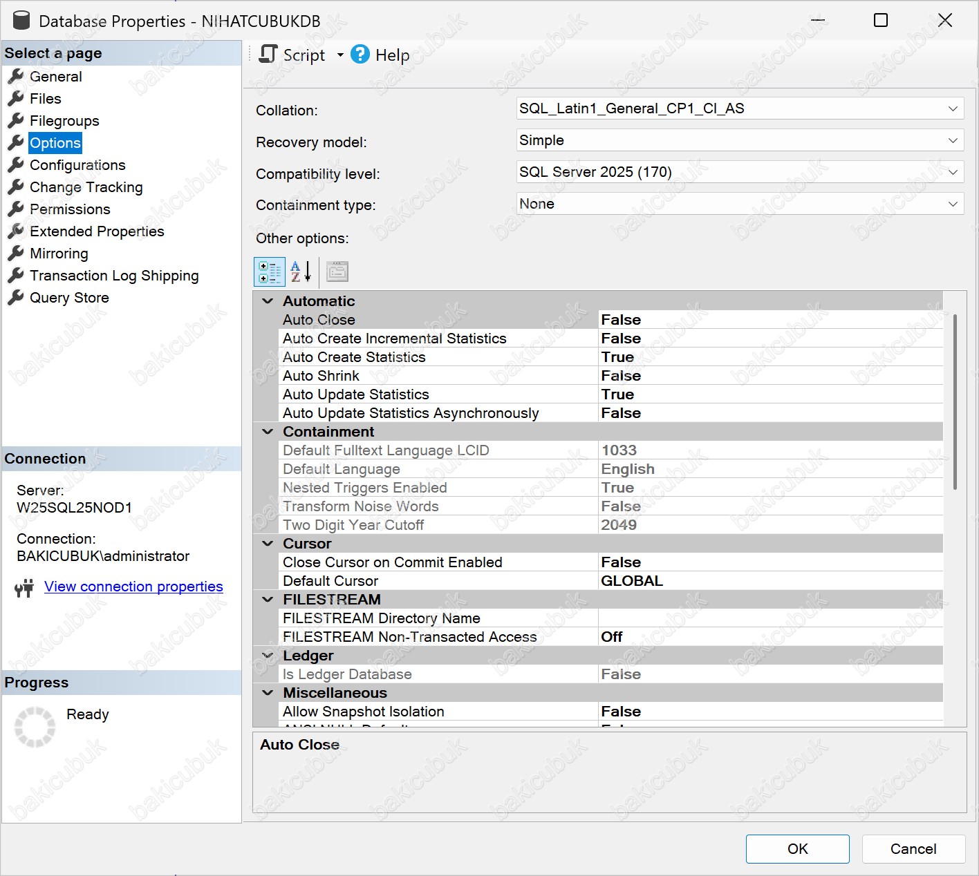 Database Properties – NIHATCUBUKDB ekranında Options sekmesinde gerekli yapılandırmayı tamamladıktan sonra OK diyerek ayarları kaydediyoruz.