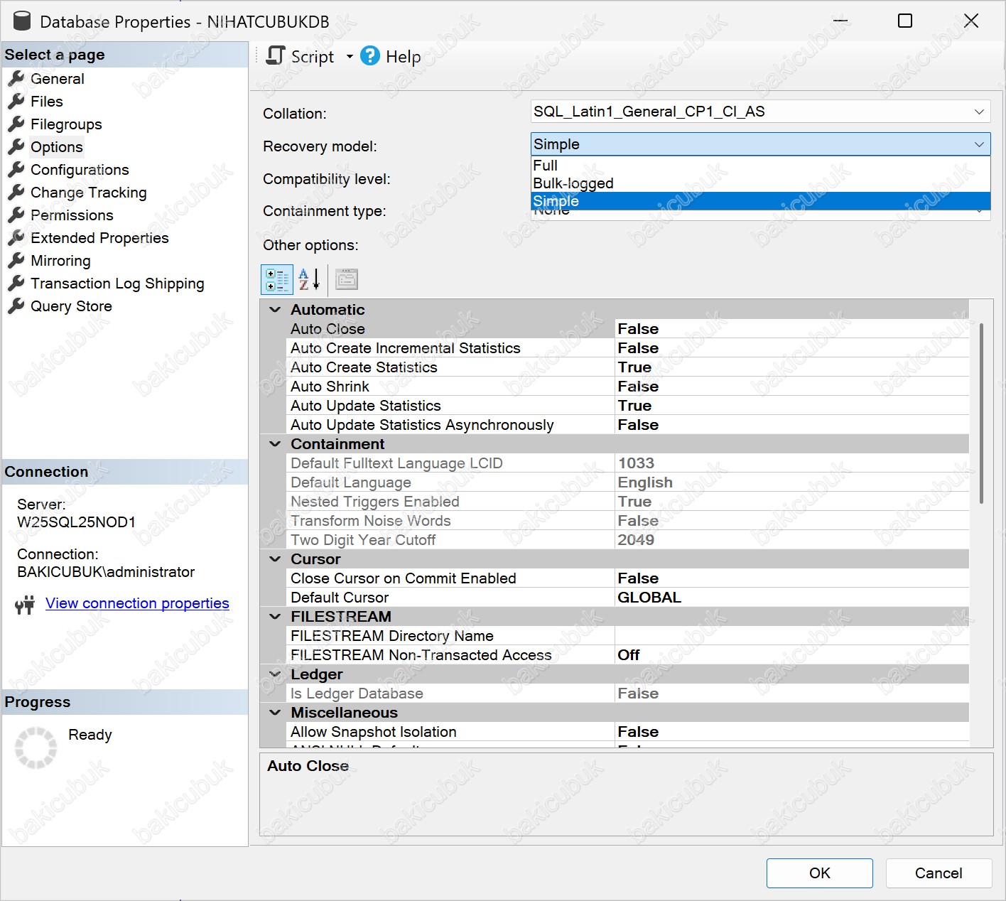 Database Properties – NIHATCUBUKDB ekranında Options sekmesine geldiğimizde, Recovery model ayarının Simple olarak yapılandırıldığını görüyoruz.