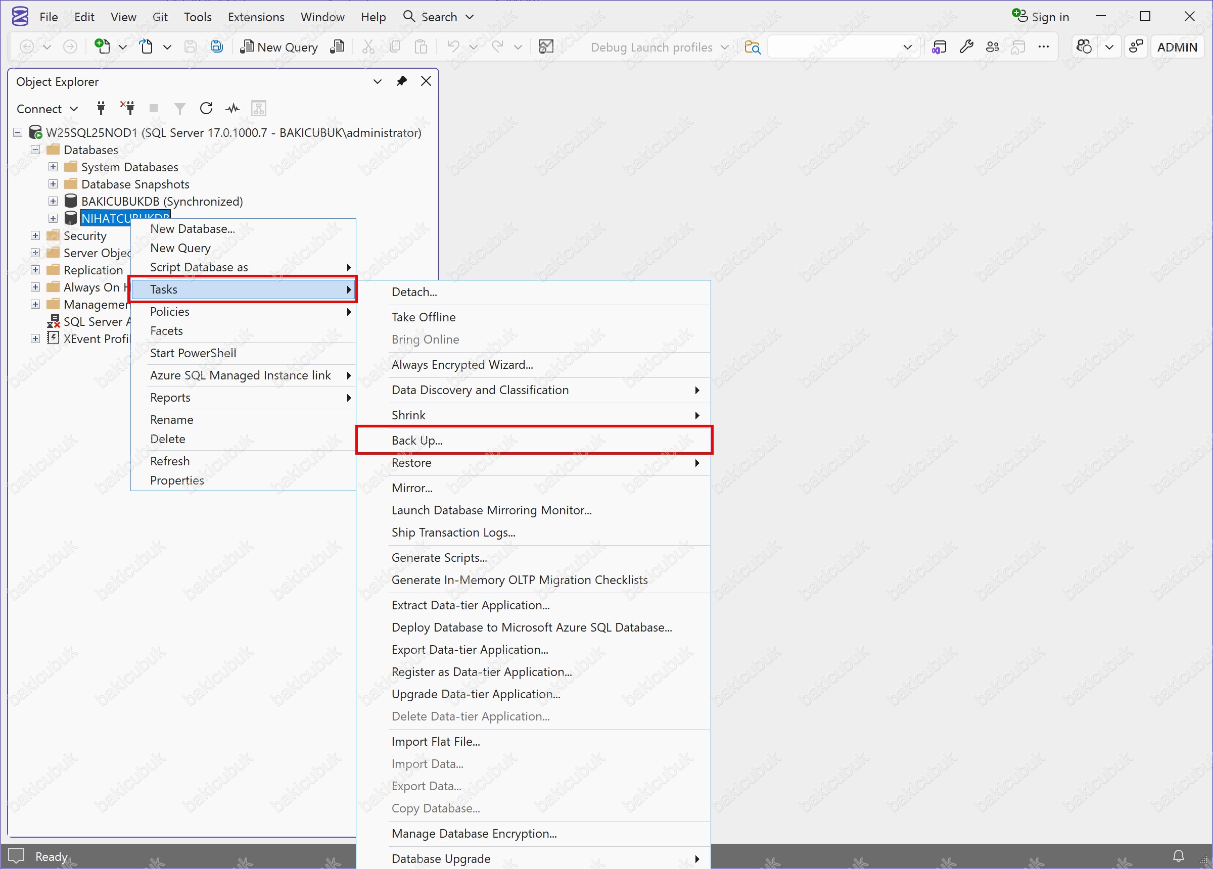 Microsoft SQL Server Management Studio (SSMS) konsolunda, Databases bölümü altında yer alan NIHATCUBUKDB isimli Database (Veritabanı) üzerinde sağ tuş Tasks menüsüne giriyoruz ve Back Up… seçeneğine tıklıyoruz.