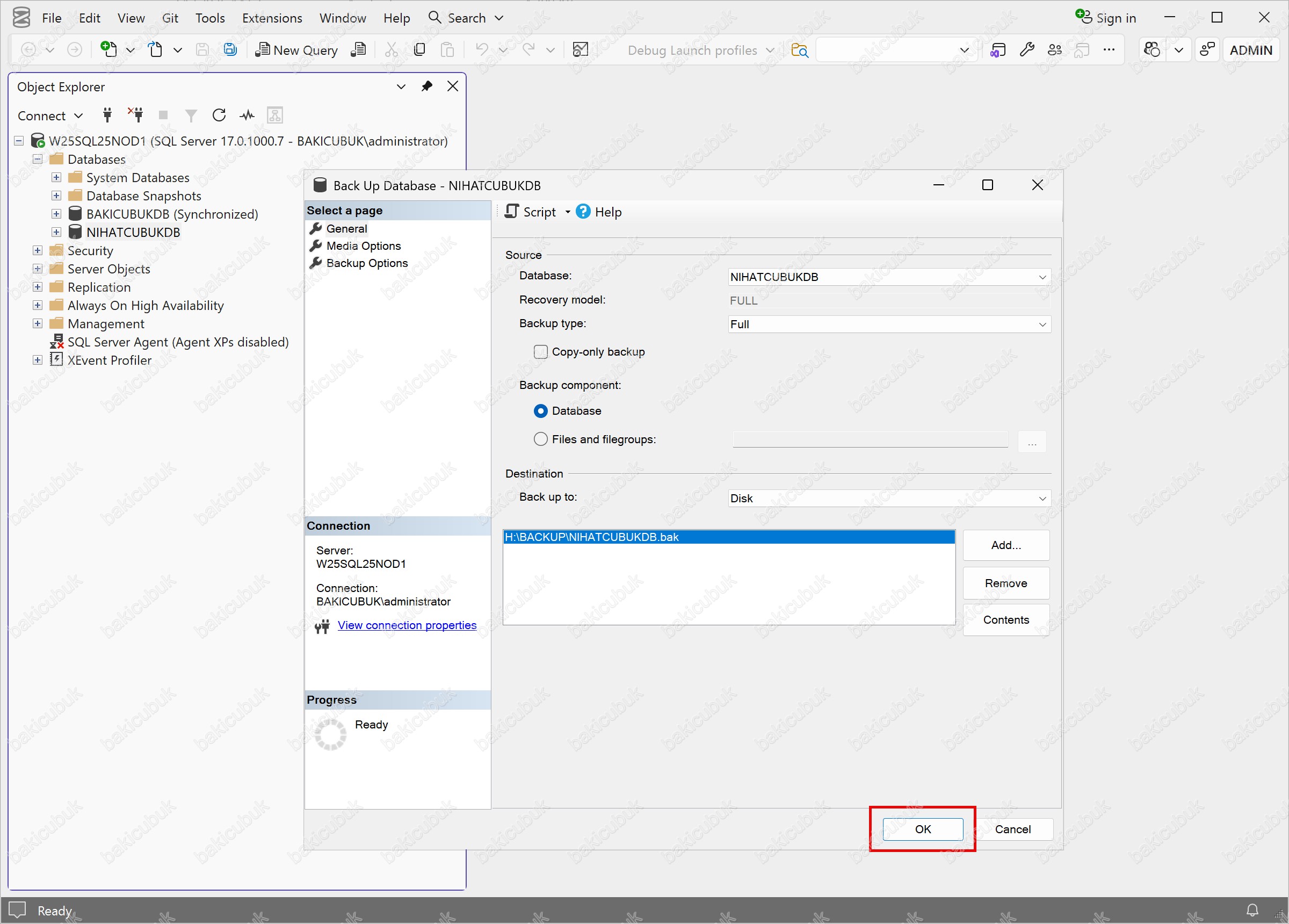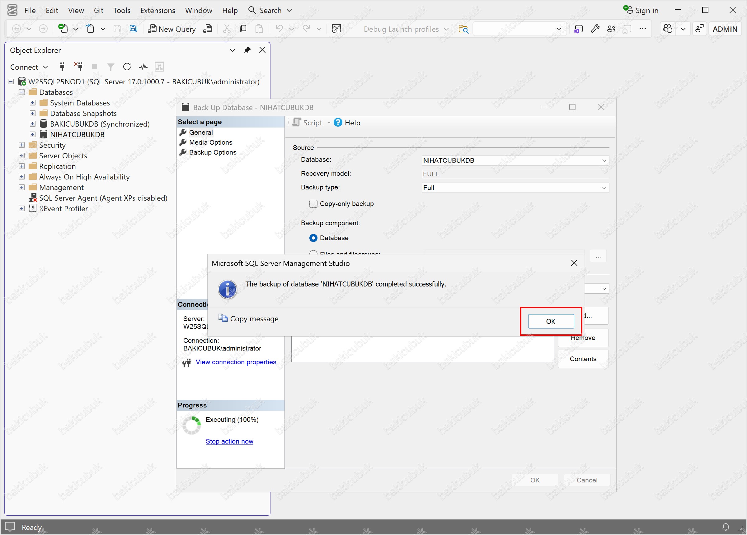 Gerekli kontrolleri tamamladıktan sonra, Back Up Database – BAKICUBUKDB ekranında OK seçeneğine tıklayarak Full Backup (Tam Yedek) alma işlemini başlatıyoruz.