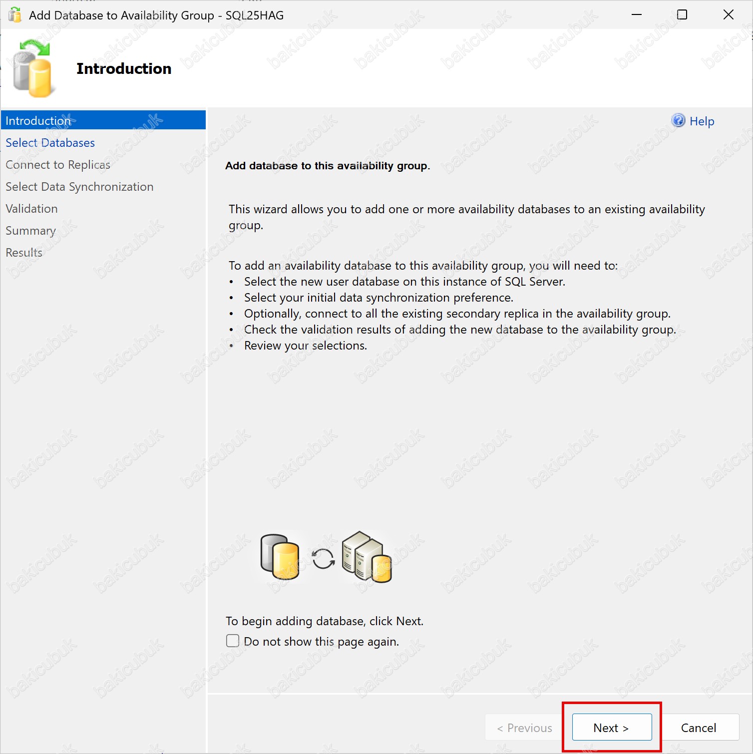 Bu adım ile Add Database to Availability Group Wizard başlatılır ve veritabanını Availability Group yapısına ekleme sürecine geçilmiş olur.