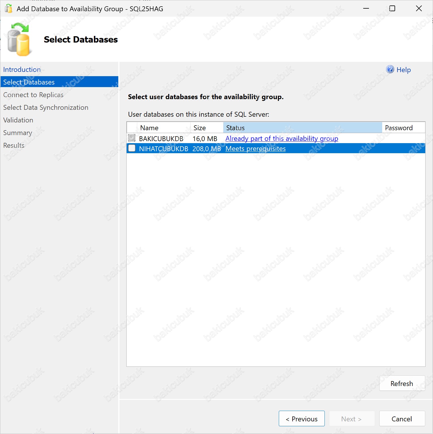 Daha önce Availability Group yapısına dahil ettiğimiz BAKICUBUK isimli Database (Veritabanı) Status bölümünde Already part of this availability group olarak görüyoruz. Bu ifade, ilgili veritabanlarının halihazırda SQL Server Always On Availability Group üyesi olduğunu ve yeniden eklenemeyeceğini gösterir.