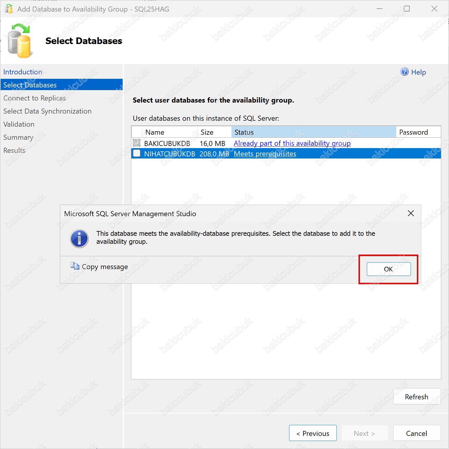 Add Database to Availability Group Wizard içerisinde yer alan Select Databases ekranında NIHATCUBUKDB isimli Database (Veritabanı)’nin Status bölümünde Meets prerequisites ifadesini görüyoruz.
