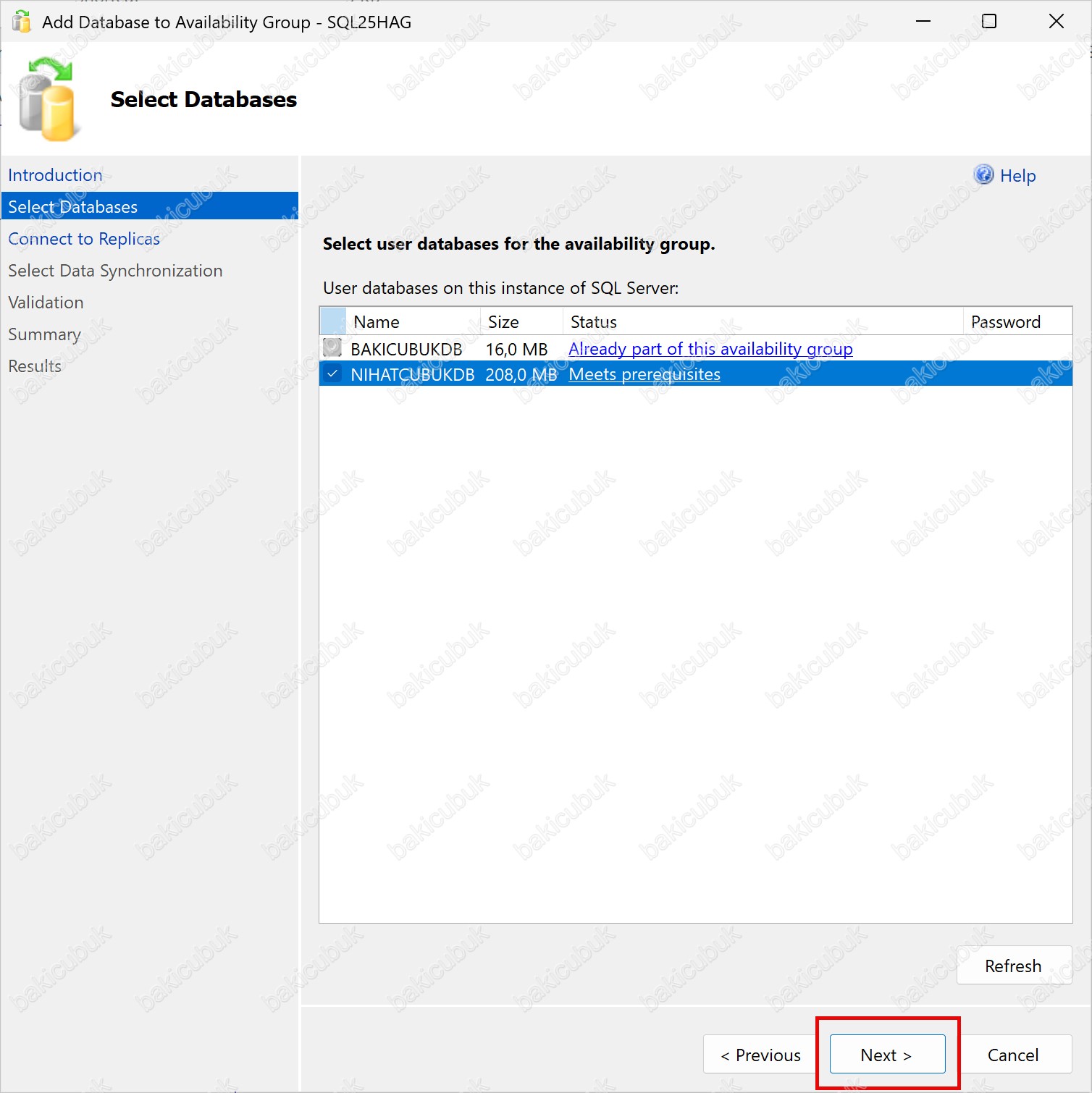 Bu aşamadan sonra NIHATCUBUKDB isimli veritabanını seçerek Next seçeneği ile devam edebilir ve veritabanını Microsoft SQL Server 2025 Always On Availability Group yapısına sorunsuz bir şekilde dahil edebiliriz.