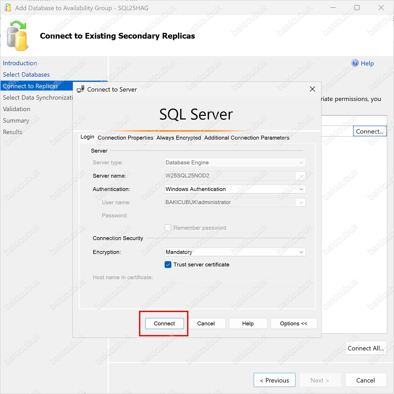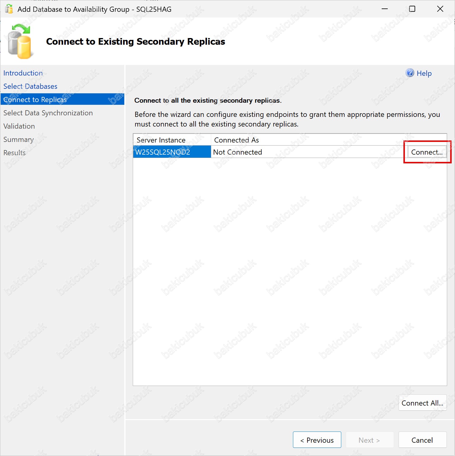 Eğer ortamda birden fazla secondary replica bulunuyorsa, Connect All seçeneğini kullanarak Microsoft SQL Server 2025 Always On Availability Group yapısındaki tüm secondary sunuculara tek seferde bağlantı sağlamak mümkündür. Bu adım, veritabanının secondary replica’lara doğru şekilde kopyalanması ve senkronizasyon sürecinin sorunsuz ilerlemesi açısından kritik öneme sahiptir.