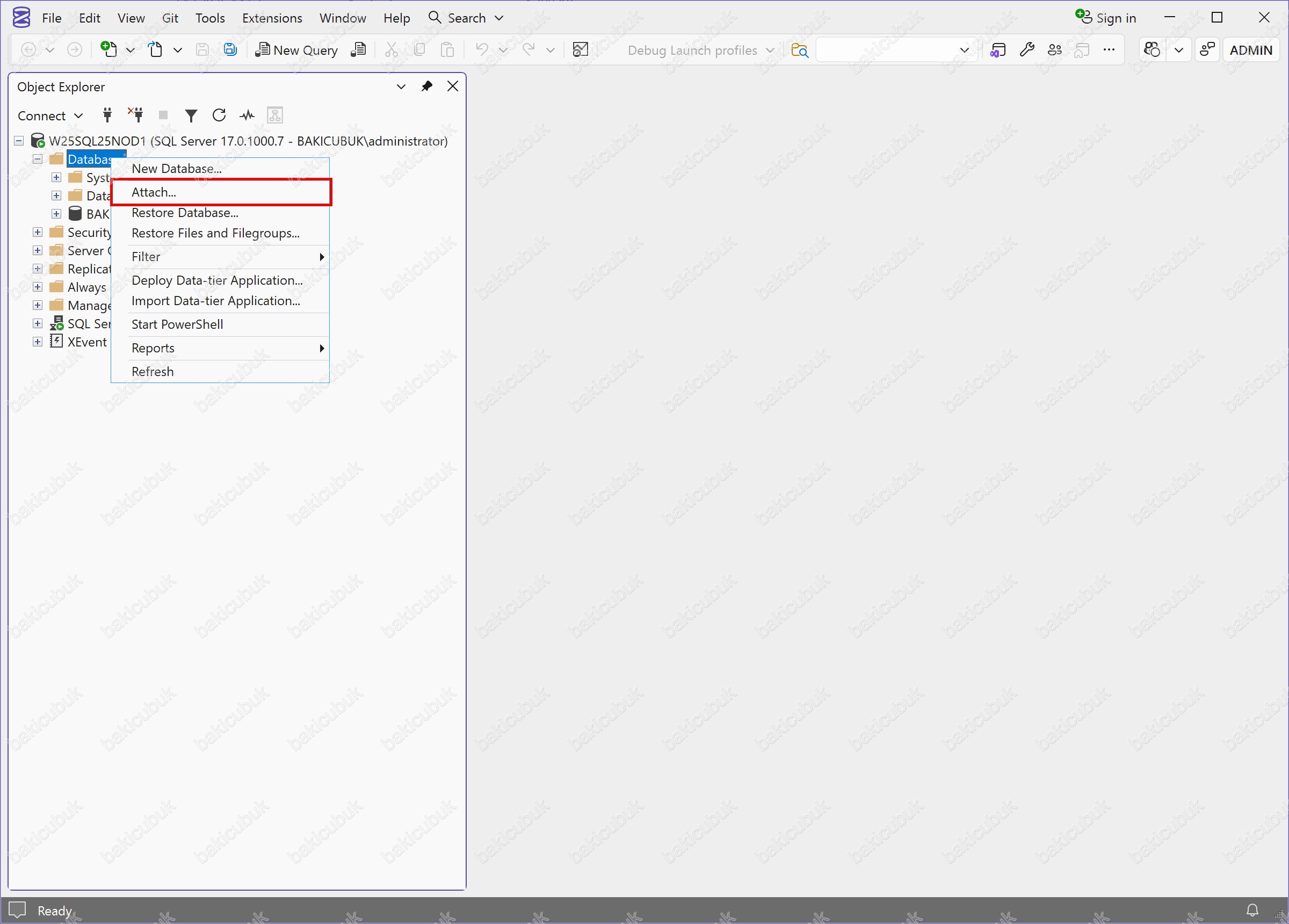W25SQL25NOD1 isimli sunucumuz üzerinde Microsoft SQL Server Management Studio (SSMS) konsolununda Databases seçeneği üzerinde sağ tuş Attach… diyerek, daha önce oluşturulmuş olan NIHATCUBUKDB isimli Database (Veritabanı) için gerekli dosyaları ekliyoruz.