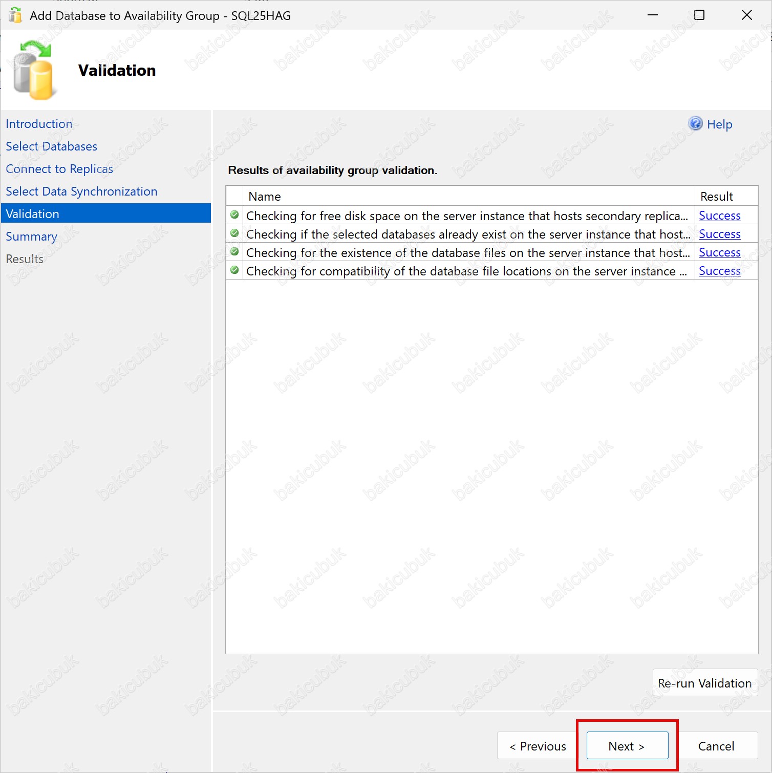 Validation ekranında NIHATCUBUKDB isimli Database (Veritabanı)’nı Availability Group yapısına dahil edebilmek için gerekli olan tüm kontrollerin otomatik olarak yapıldığını görüyoruz.