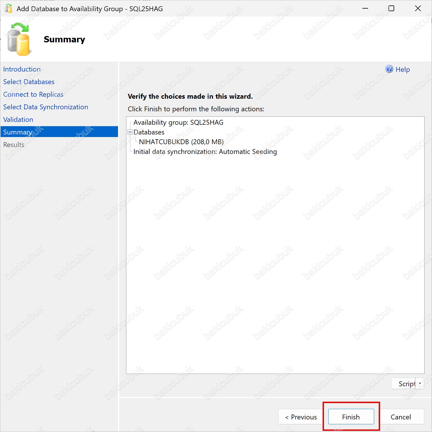 Summary ekranında ayrıca Script bölümü sayesinde, Availability Group’a veritabanı eklemek için yapılan tüm yapılandırmaları Script (Senaryo) olarak oluşturabilir ve kaydedebilirsiniz. Bu özellik; Dokümantasyon, Denetim (Audit) ve benzer ortamlar için tekrar kullanılabilir kurulumlar açısından önemli bir avantaj sağlar.