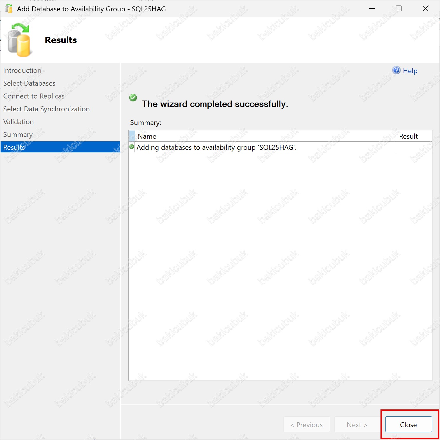 Results ekranında gerçekleştirilen işlemin sonucunu özetleyen ve herhangi bir hata oluşup oluşmadığını gösteren son kontrol adımıdır. Bu ekranın sorunsuz şekilde tamamlanması, veritabanının Availability Group mimarisine başarılı bir şekilde entegre edildiğini doğrular.