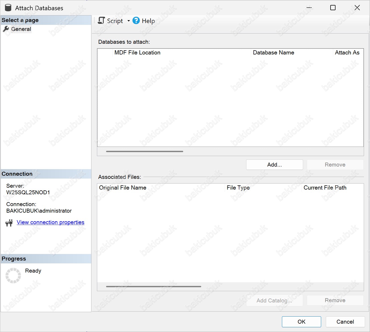 Attach Databases ekranında General sekmesine geldiğimizde, Database to attach bölümü karşımıza gelir.