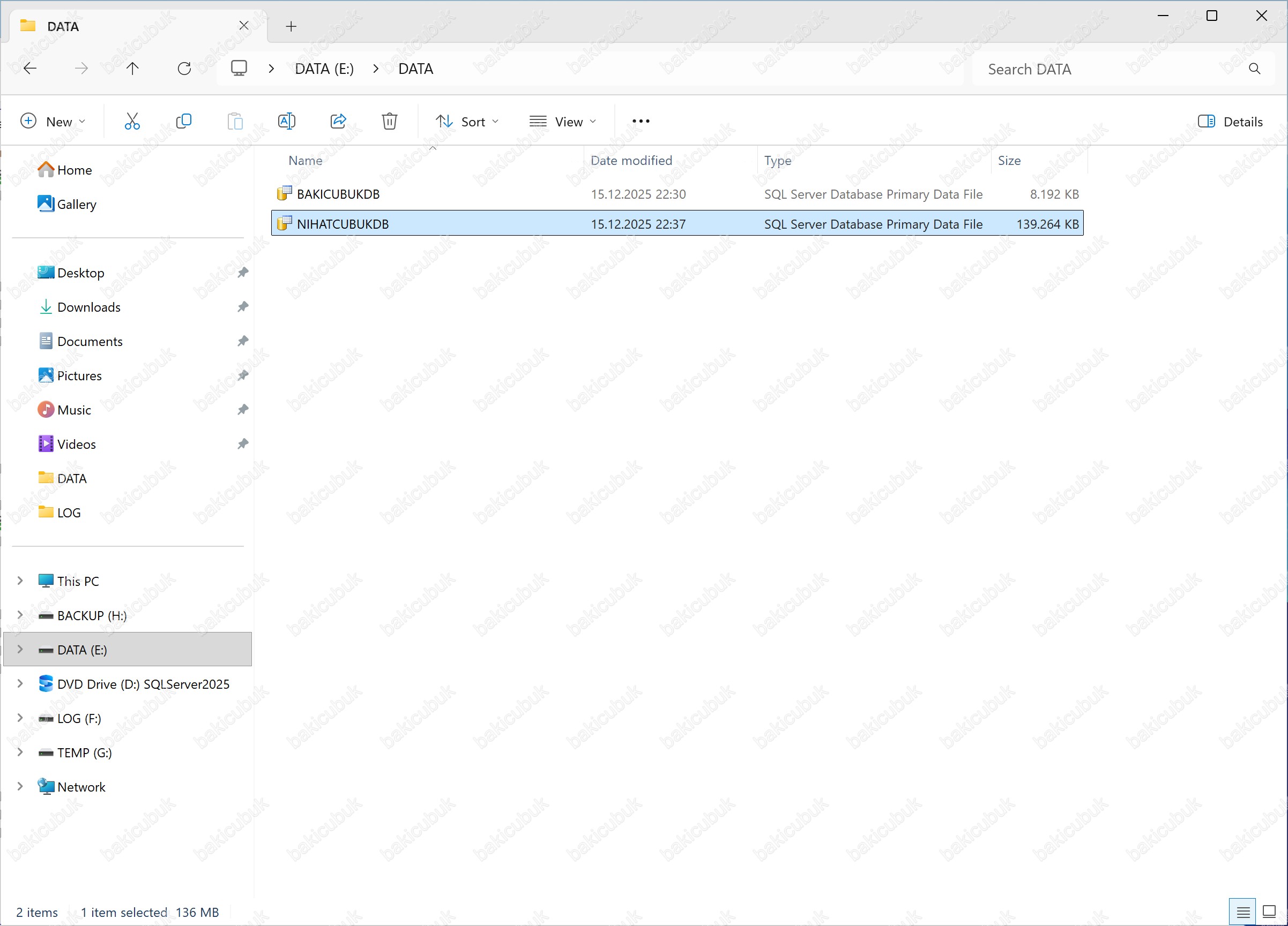 Bu adımda, NIHATCUBUKDB.mdf isimli Primary Data File (.mdf) dosyasını, Microsoft SQL Server 2025 Always On Availability Group yapısında yapılandırılmış olan E:\DATA dizinine kopyalıyoruz.