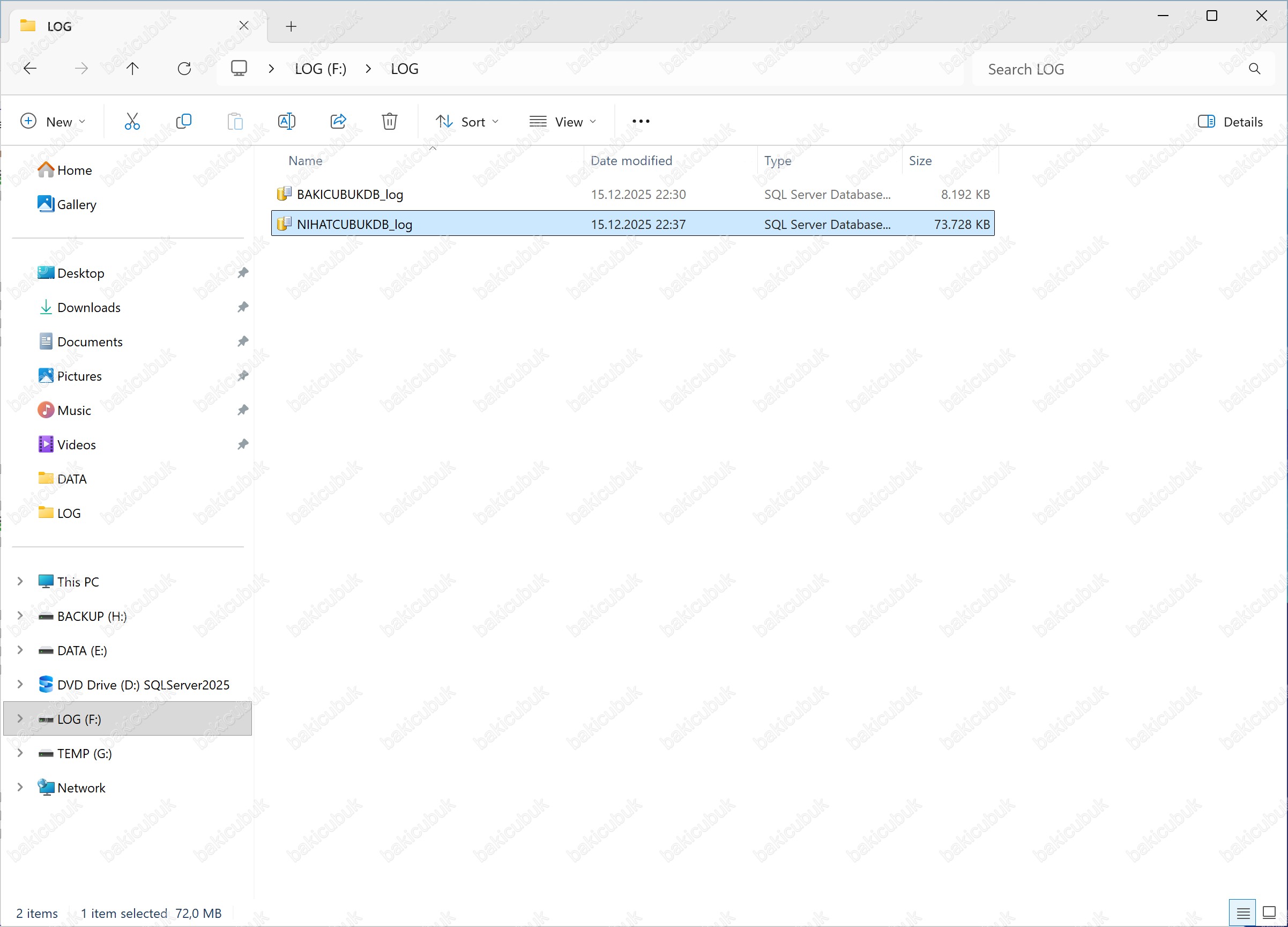NIHATCUBUKDB_log isimli SQL Server Database Transaction Log File (.ldf) dosyasını, Microsoft SQL Server 2025 Always On Availability Group yapısında yapılandırılmış olan F:\LOG dizinine kopyalıyoruz.