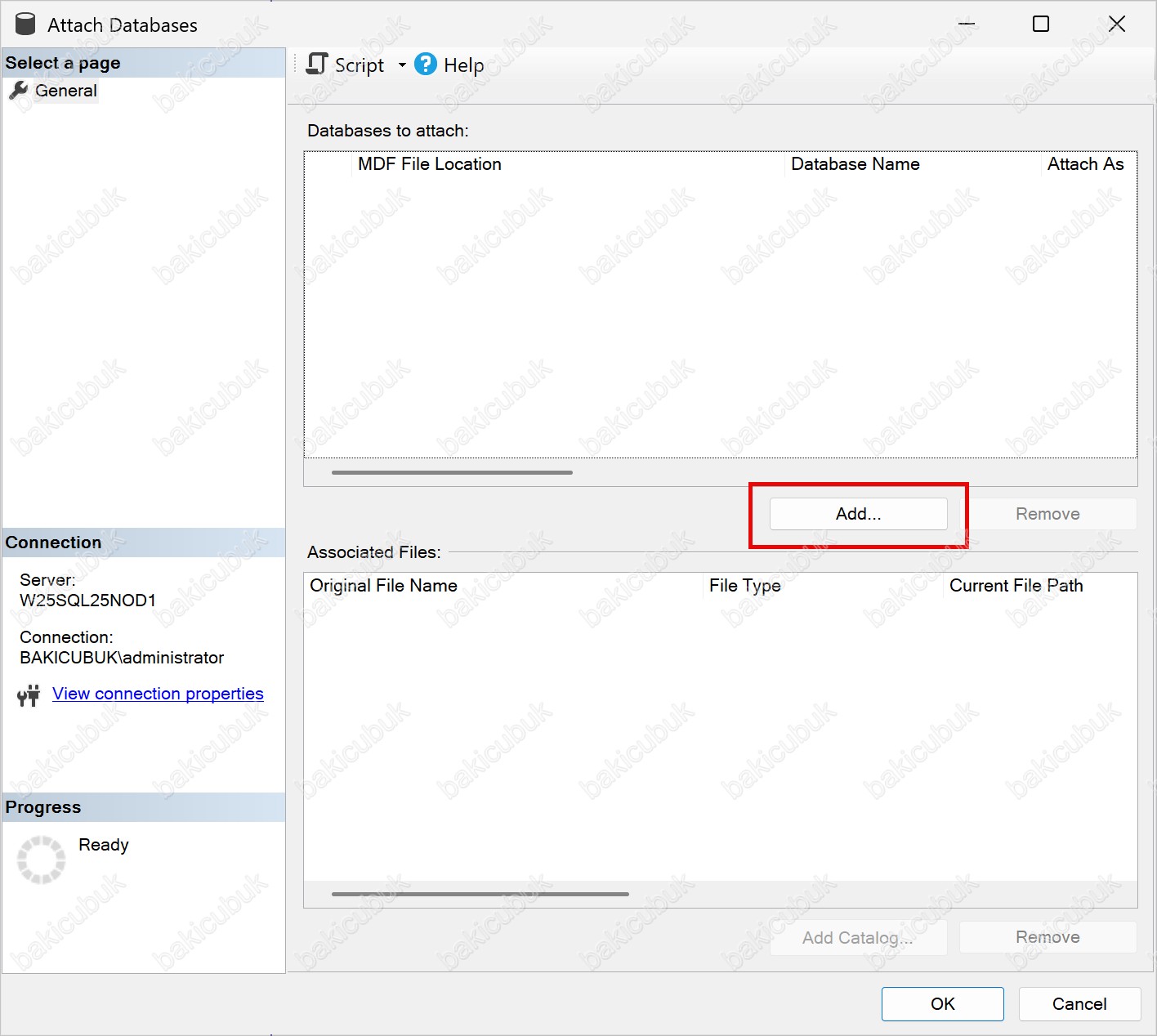 Attach Databases ekranında General sekmesinde, Database to attach bölümünde Add seçeneğine tıklıyoruz.