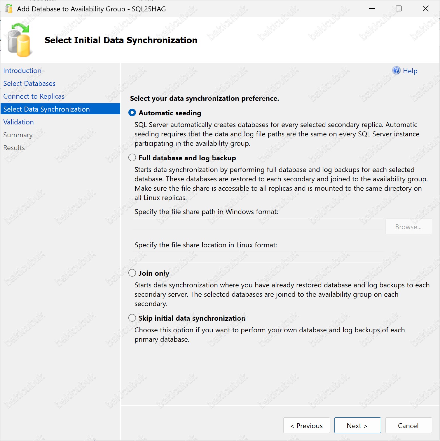 - Join only seçeneğinde, Availability Group’a eklenecek her bir veritabanı için Full Backup ve Transaction Log Backup işlemlerinin manuel olarak alınmış olması gerekir. Bu yedeklerin, bu adıma geçilmeden önce manuel olarak Secondary sunucuya kopyalanmış ve veritabanlarının RESTORING durumunda hazır hale getirilmiş olması zorunludur.