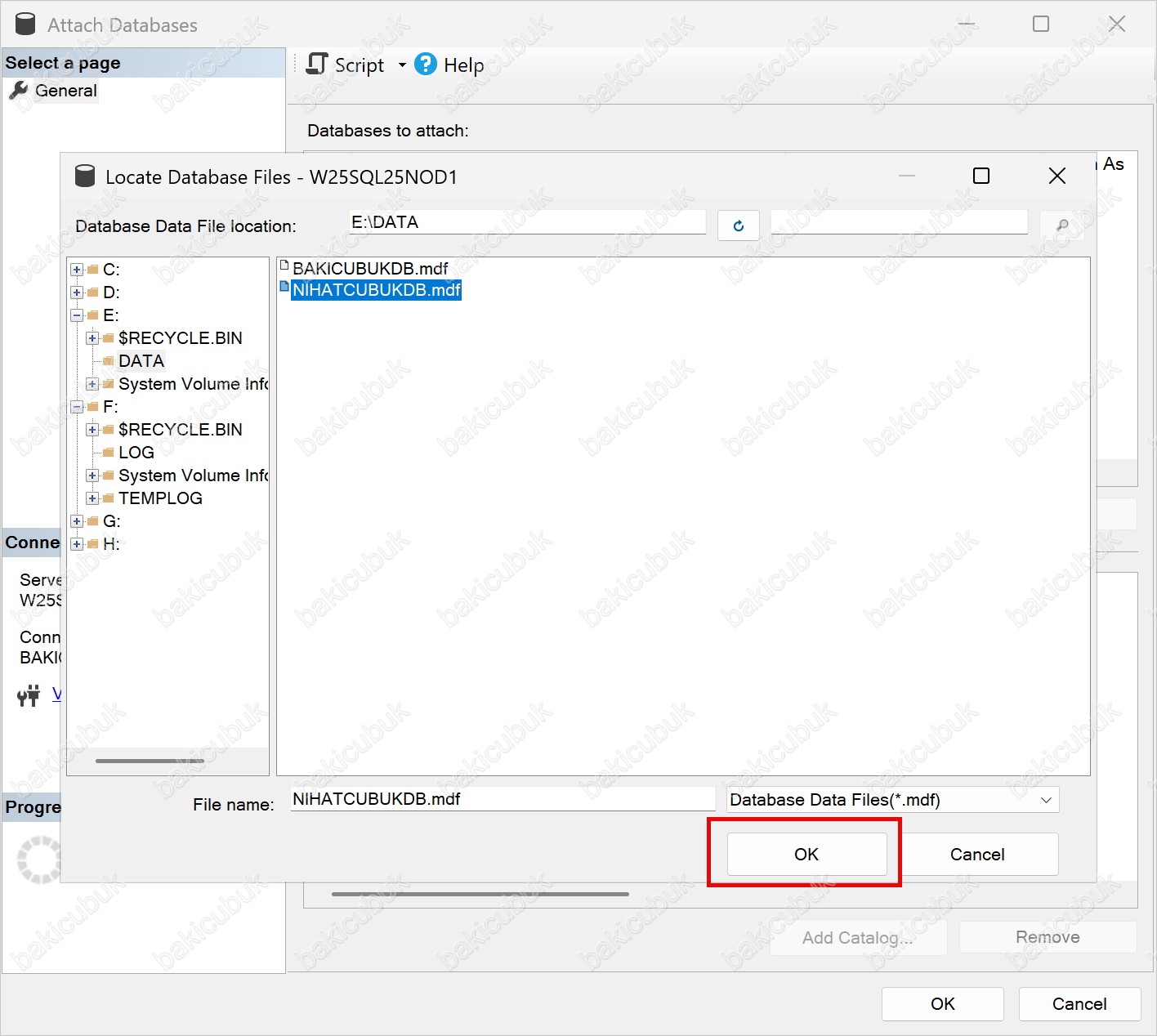 - MDF File Location alanında, seçmiş olduğumuz veritabanına ait Primary Data File (.mdf) dosyasının yolu E:\DATA\NIHATCUBUKDB.mdf olarak görüntülenir. Bu, veritabanı dosyasının doğru dizinden eklendiğini gösterir.