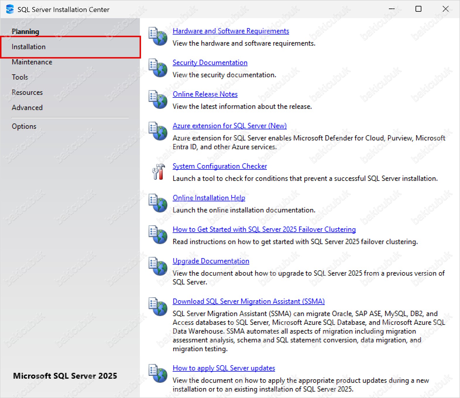 SQL Server Installation Center ekranında Installation menüsüne tıklayarak Microsoft SQL Server 2025 kurulum sürecini başlatıyoruz. Bu adım, yeni bir Microsoft SQL Server 2025 kurulumu yapmak veya mevcut bir kurulum üzerine ek özellikler eklemek için kullanılan temel giriş noktasıdır. Installation menüsü üzerinden başlatılan sihirbaz, sonraki adımlarda kurulum türü, lisanslama, özellik seçimi ve sistem yapılandırmasına yönelik adım adım ilerlememizi sağlar.