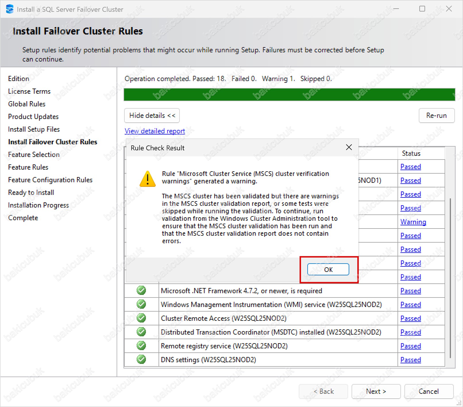 Install Failover Cluster Rules ekranında karşılaşılan Microsoft Cluster Service (MSCS) cluster verification warnings uyarısı, Windows Server Failover Cluster (WSFC) doğrulama testlerinin daha önce çalıştırıldığını ancak bazı testlerin Warning ile sonuçlandığını veya bazı doğrulama adımlarının Skipped (atlanmış) olabileceğini ifade eder.