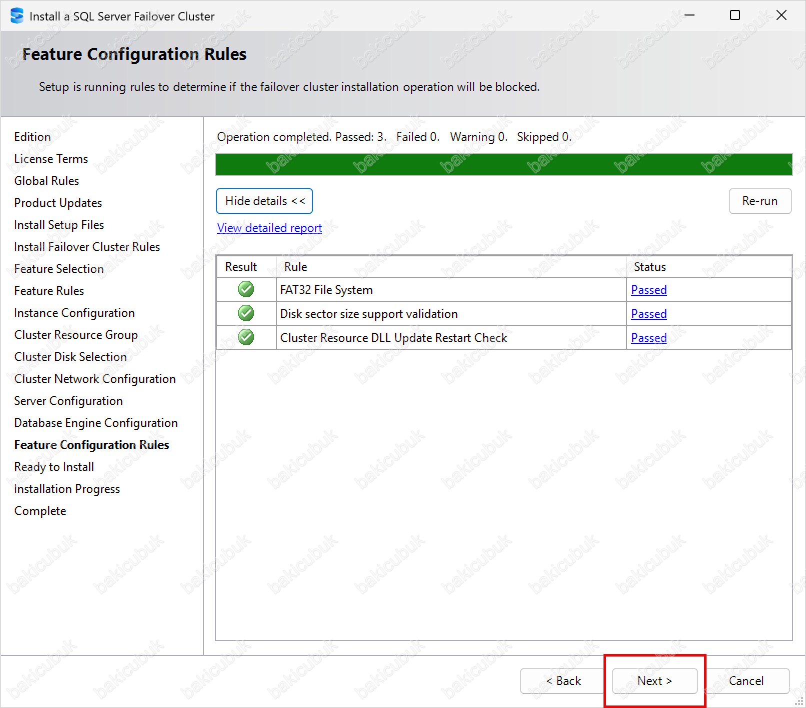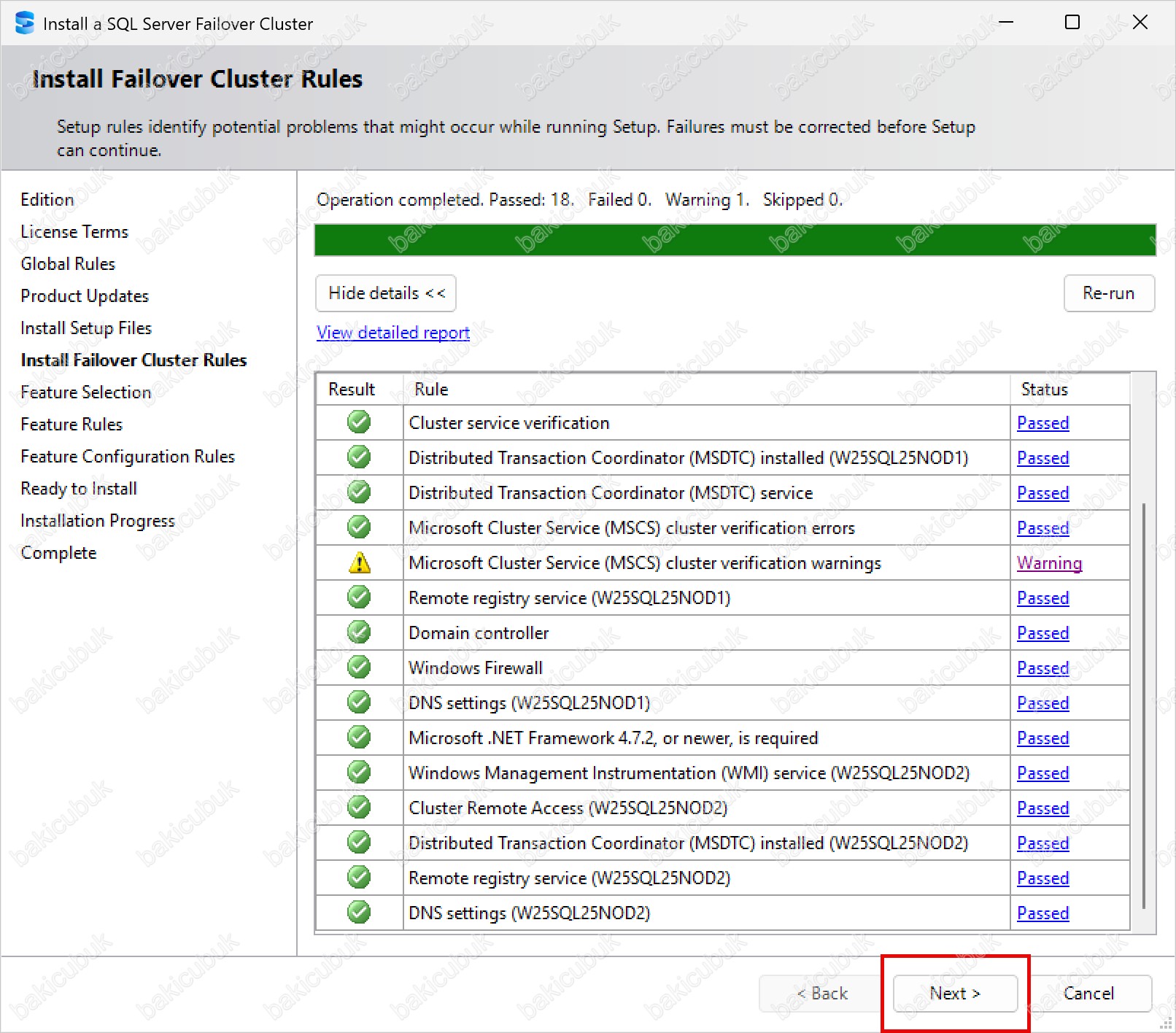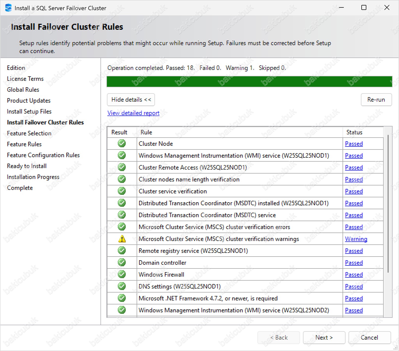Kontrollerin tamamlanmasının ardından tüm maddelerin Passed olarak işaretlendiğini görüyoruz. Bu durum, ortamın Microsoft SQL Server 2025 Failover Cluster kurulumu için hazır olduğunu ve kurulum sürecinin bir sonraki adıma sorunsuz şekilde ilerleyebileceğini gösterir.