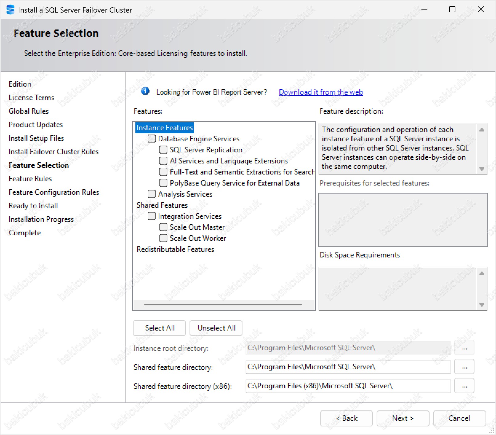Feature Selection ekranında Microsoft SQL Server 2025 kurulumunda hangi bileşenlerin ve servislerin kurulacağını belirlediğimiz kritik yapılandırma adımıdır. Bu ekranda özellikle Database Engine Services bileşeninin seçilmesi zorunludur; çünkü SQL Server’ın temel veritabanı işlevlerini sağlayan ana servisidir. Diğer servisler ve özellikler ise ortamın gereksinimlerine, kullanım senaryosuna ve SQL Server’ın hangi amaçla yapılandırılacağına bağlı olarak isteğe bağlı şekilde seçilir.