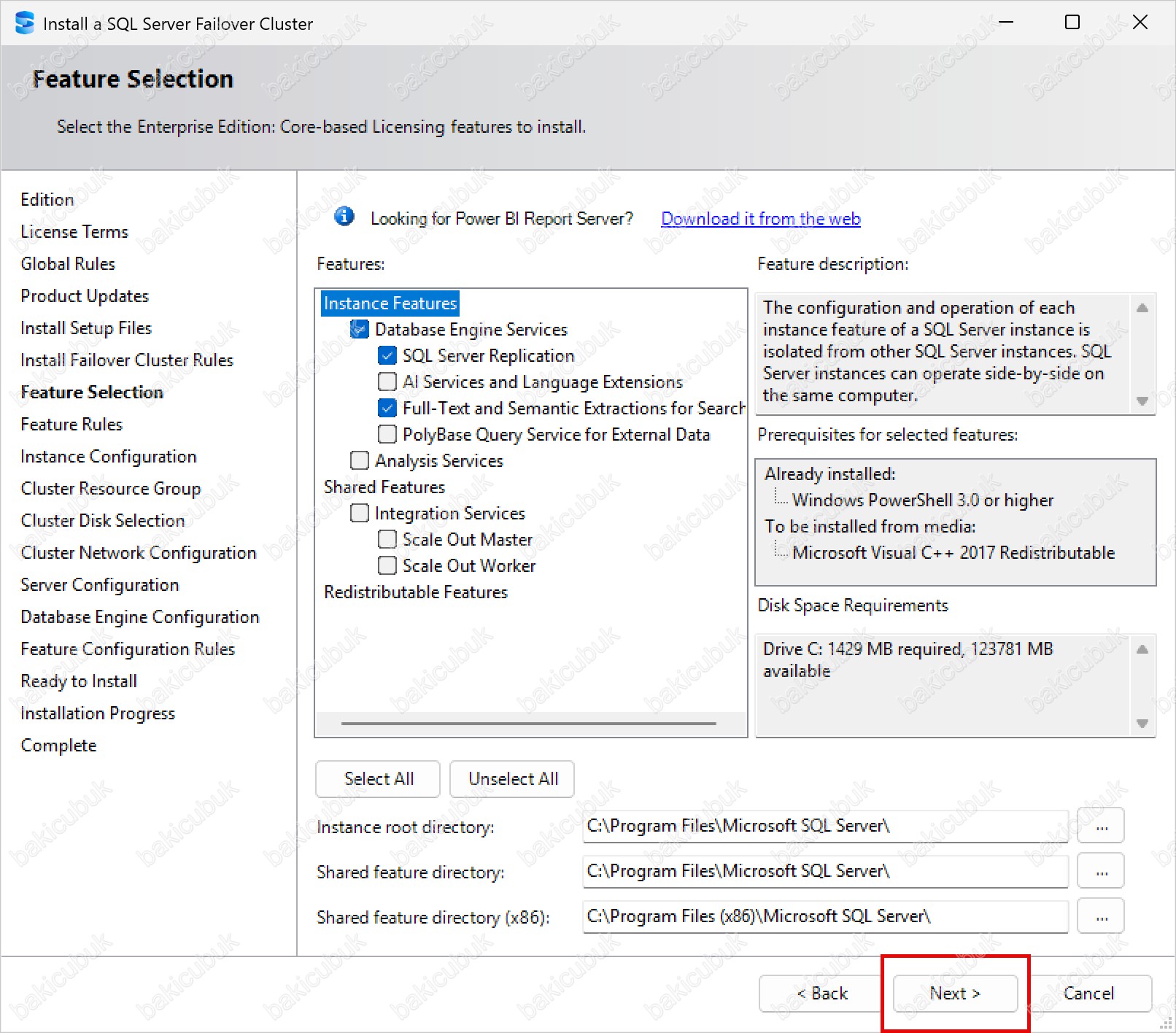 Features Configuration Rules ekranında hatasız bir şekilde geçilmesi, Microsoft SQL Server 2025 kurulum ve yapılandırma sürecinin doğru ve sağlıklı ilerlediğinin en önemli göstergelerinden biridir. Tüm kontroller başarılı bir şekilde tamamlandığında Next seçeneğine tıklayarak Microsoft SQL Server 2025 kurulumunun bir sonraki aşamasına geçiyoruz.