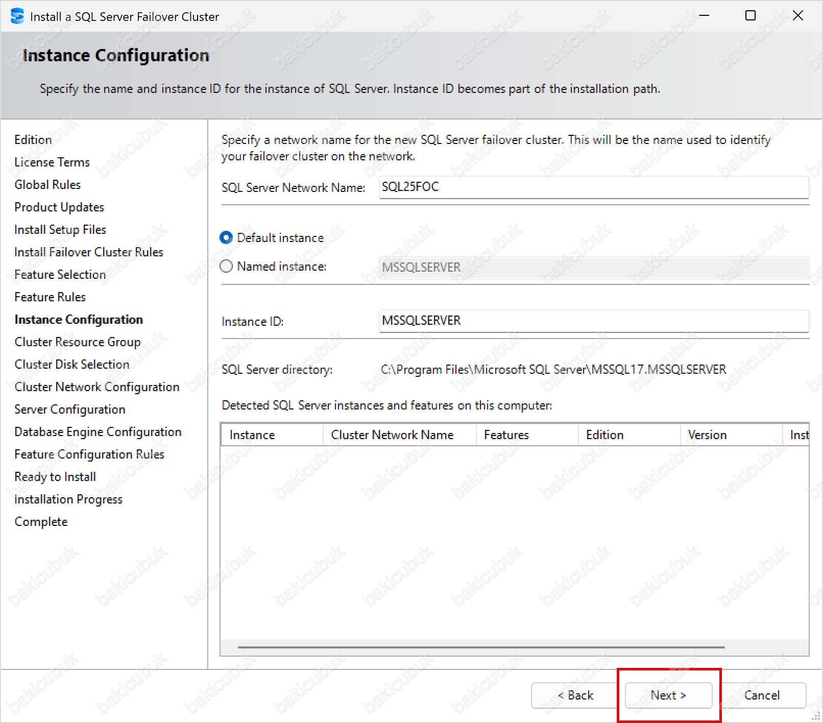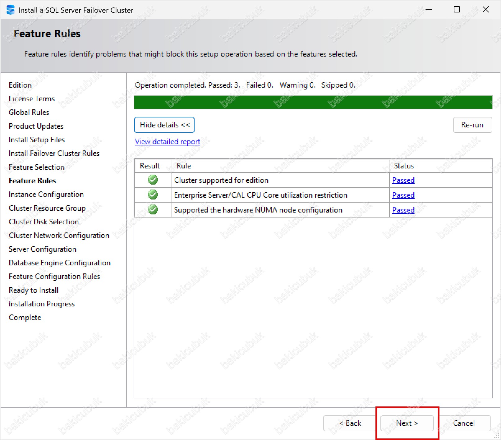 Install Failover Cluster Rules ekranında yapılan kontrollerin başarıyla tamamlandığını gördükten sonra, Microsoft SQL Server 2025 Failover Cluster Instance (FCI) kurulumuna devam etmek için Next seçeneğine tıklayarak bir sonraki adıma geçiyoruz.