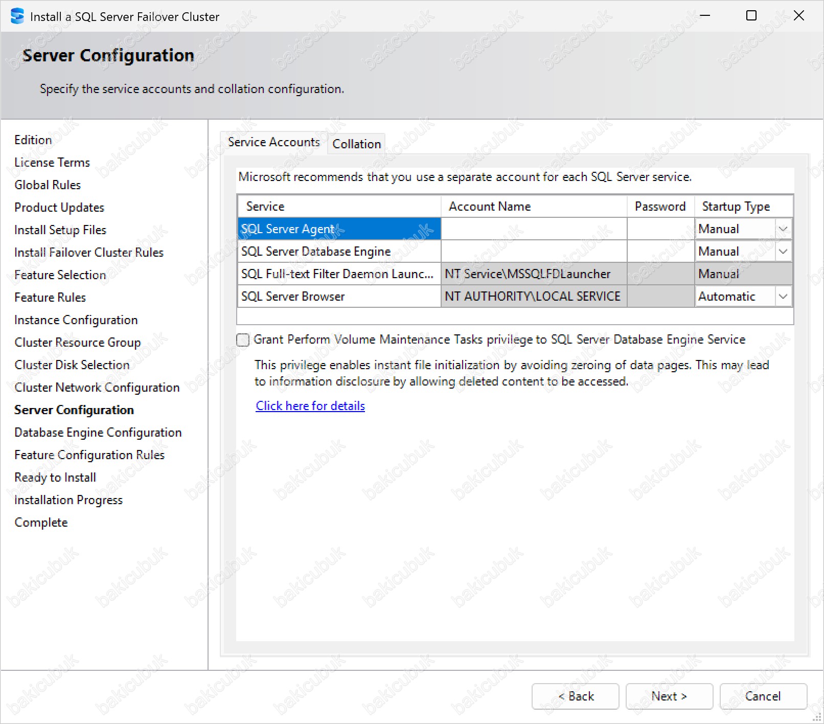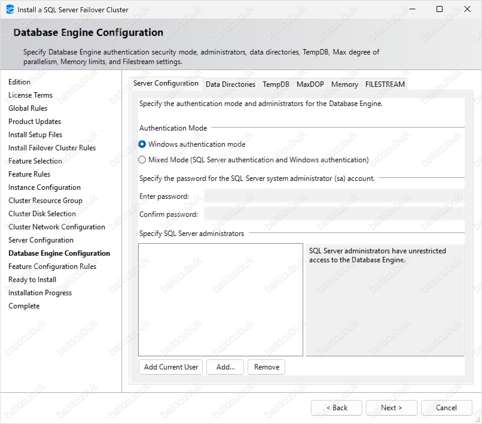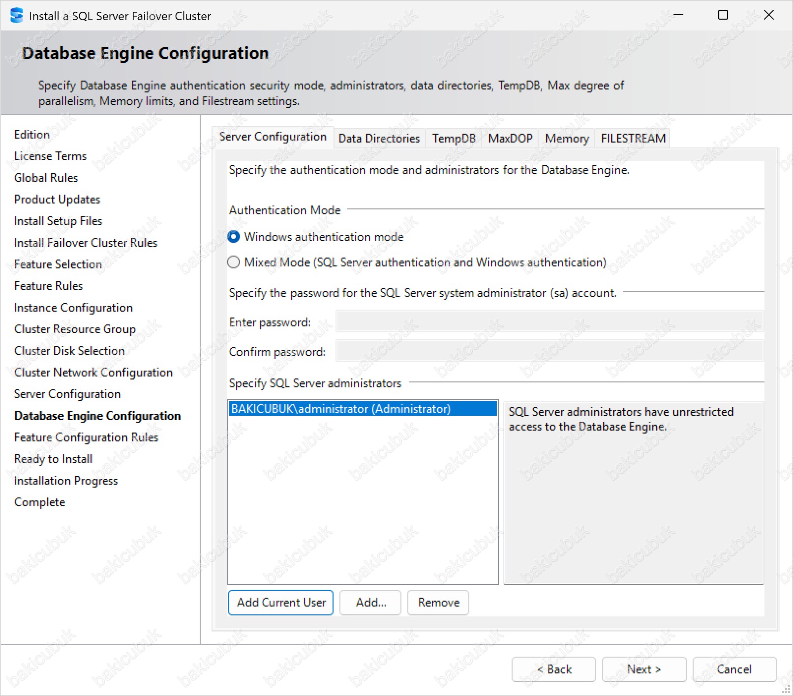 MaxDOP, Memory ve FILESTREAM seçenekleri, Microsoft SQL Server 2025 kurulumu sırasında yapılandırılabilse de, Failover Cluster Instance (FCI) mimarisi için doğrudan kritik bileşenler arasında yer almaz. Failover Cluster Instance (FCI) yapısının sağlıklı çalışması; Windows Server Failover Cluster (WSFC) yapılandırması, Quorum ayarları ve Cluster Shared Volumes (CSV) altyapısının tüm Node’lar tarafından tutarlı şekilde erişilebilir olmasına bağlıdır. Bu nedenle MaxDOP, Memory ve FILESTREAM ayarlarının hatalı yapılandırılması, Failover Cluster Instance (FCI) mimarisinin failover mekanizmasını doğrudan engellemez. Ancak bu ayarların doğru planlanması, Failover Cluster Instance (FCI) üzerinde çalışan veritabanlarının performansı ve sistemin genel verimliliği açısından önemlidir.