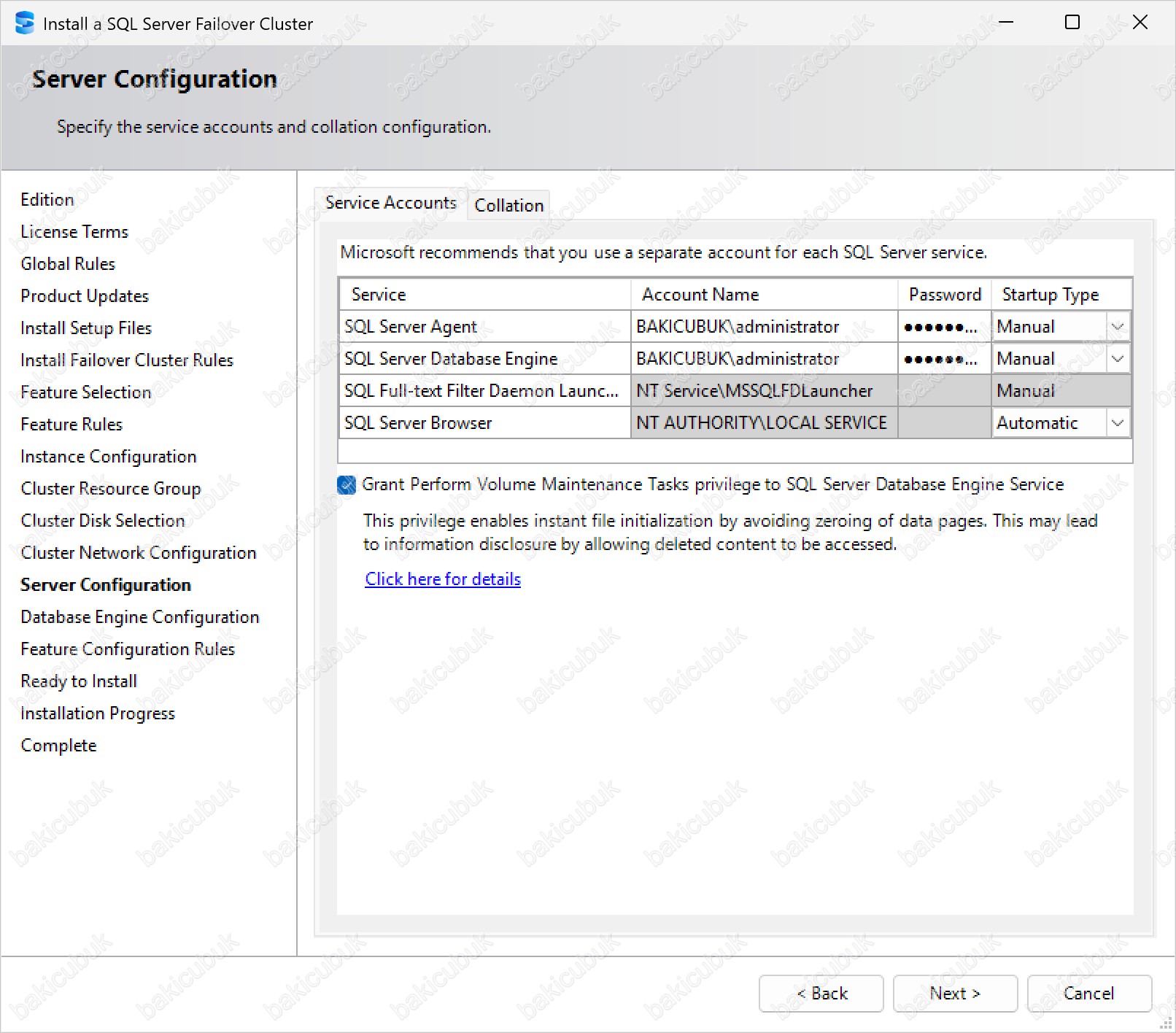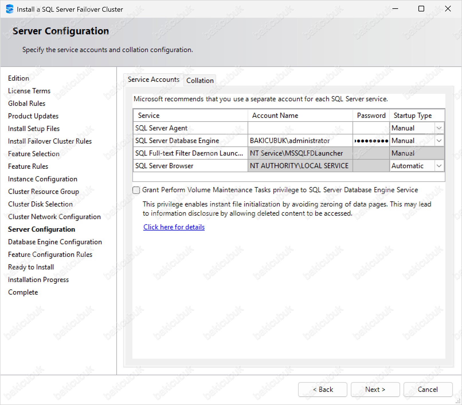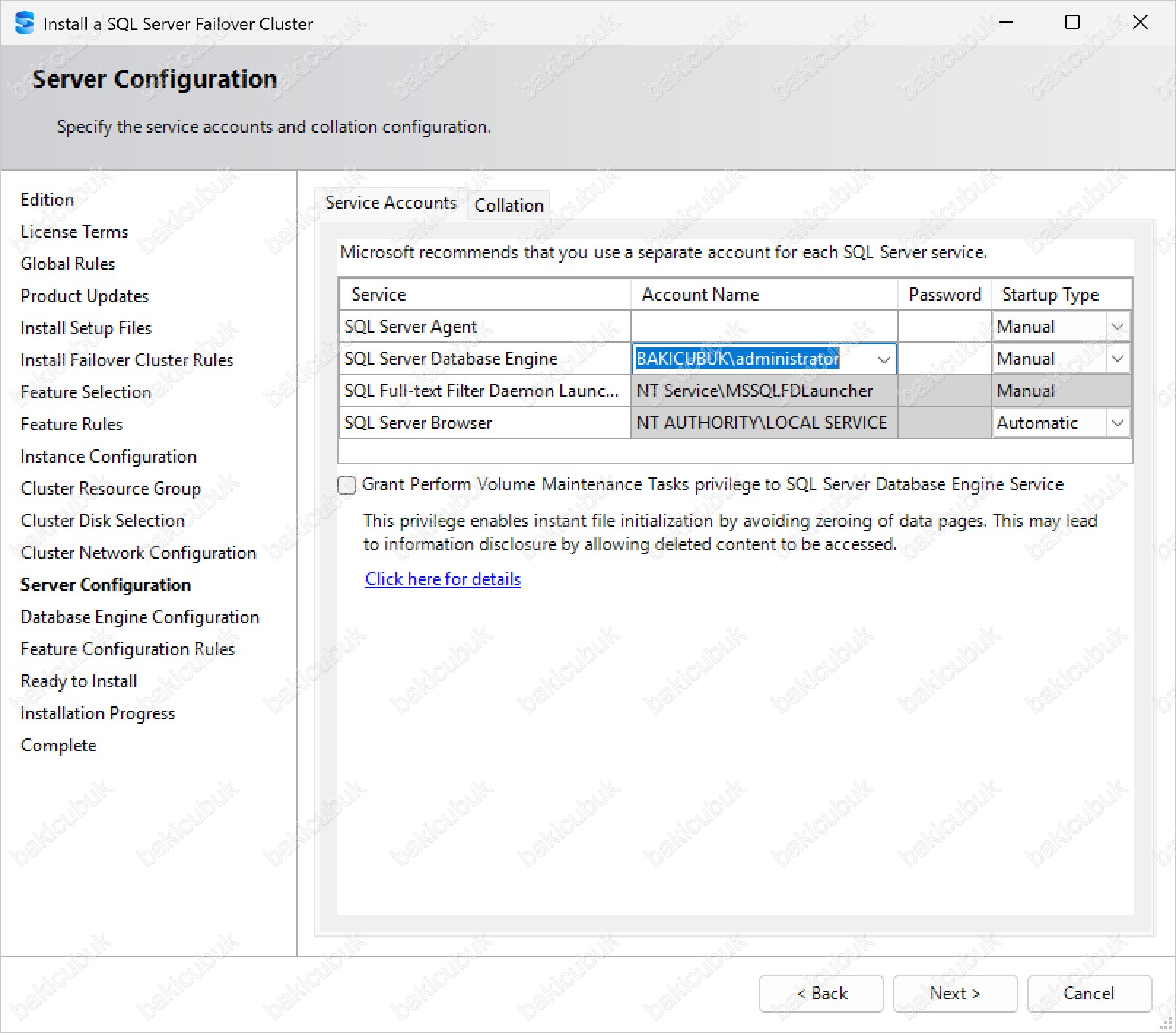 MaxDOP, Memory ve FILESTREAM seçenekleri, Microsoft SQL Server 2025 kurulumu sırasında yapılandırılabilse de, Failover Cluster Instance (FCI) mimarisi için doğrudan kritik bileşenler arasında yer almaz. Failover Cluster Instance (FCI) yapısının sağlıklı çalışması; Windows Server Failover Cluster (WSFC) yapılandırması, Quorum ayarları ve Cluster Shared Volumes (CSV) altyapısının tüm Node’lar tarafından tutarlı şekilde erişilebilir olmasına bağlıdır. Bu nedenle MaxDOP, Memory ve FILESTREAM ayarlarının hatalı yapılandırılması, Failover Cluster Instance (FCI) mimarisinin failover mekanizmasını doğrudan engellemez. Ancak bu ayarların doğru planlanması, Failover Cluster Instance (FCI) üzerinde çalışan veritabanlarının performansı ve sistemin genel verimliliği açısından önemlidir.