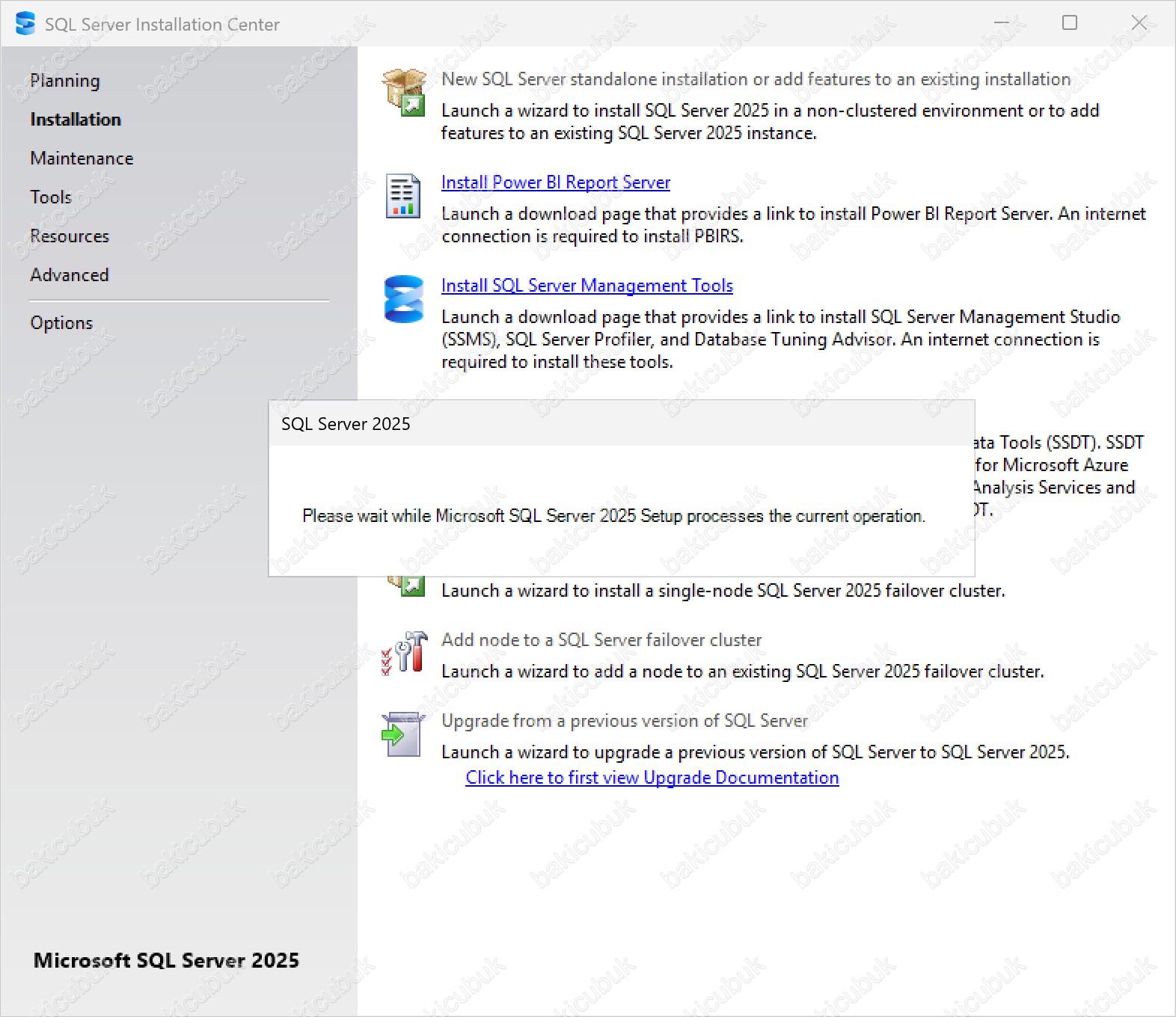 SQL Server Installation Center ekranında Microsoft SQL Server 2025 kurulumu için gerekli yapılandırma sürecinin başlatıldığını görüyoruz.
