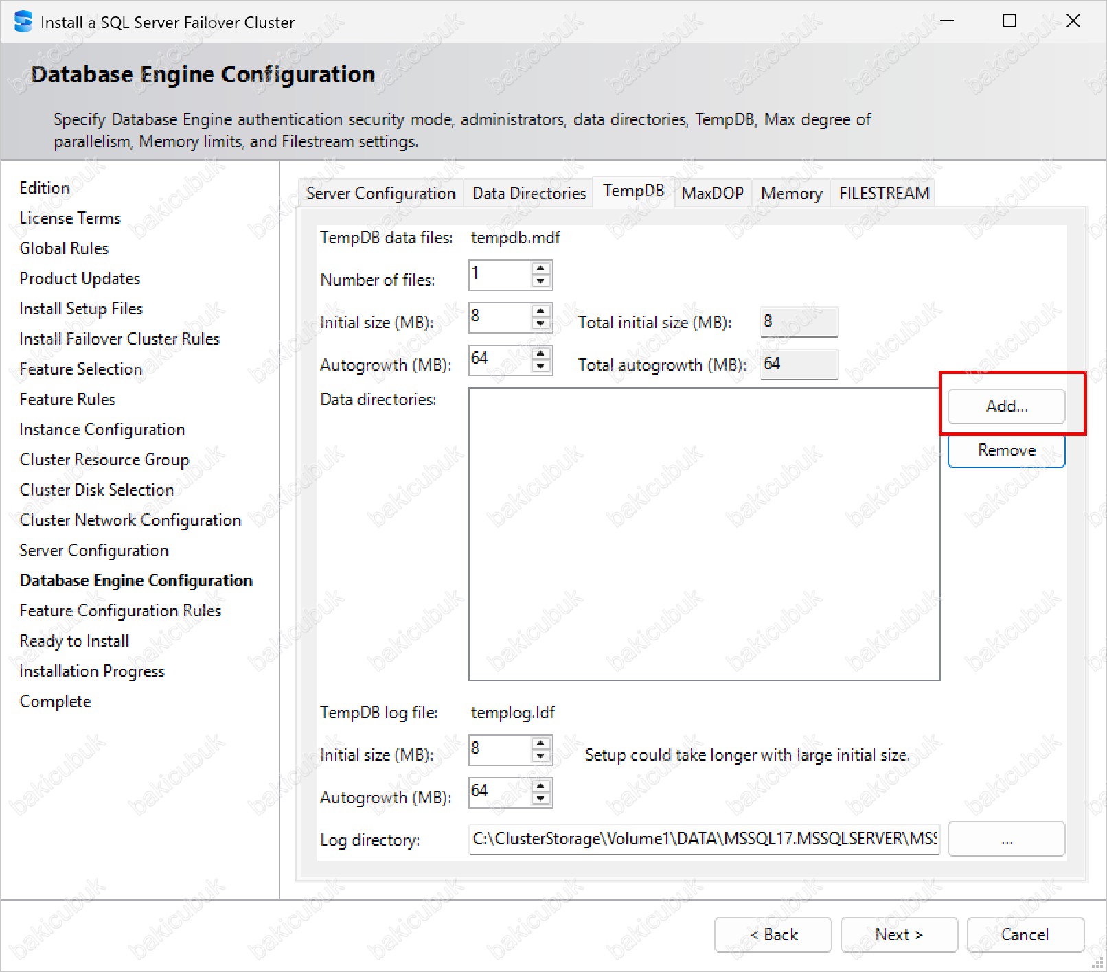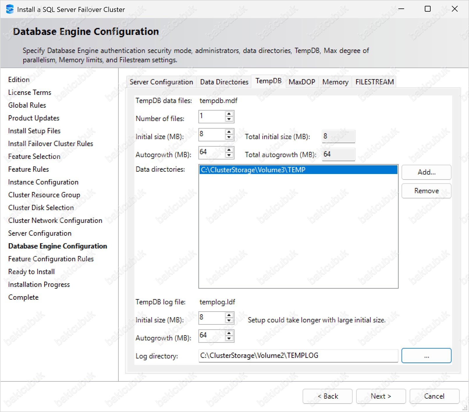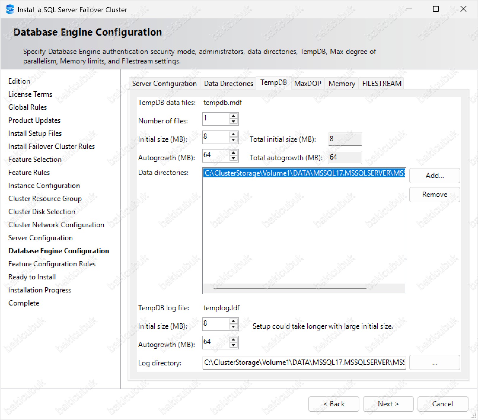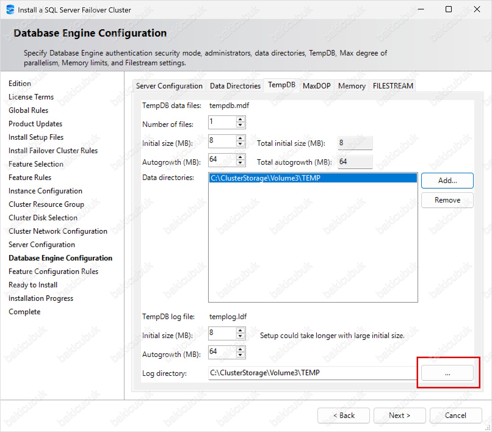 Database Engine Configuration ekranında yer alan TempDB sekmesindeki Data directories bölümüne ait dizin yapılandırmasını tamamlıyoruz. Bu adım ile TempDB veri dosyalarının Failover Cluster Instance (FCI) mimarisinde sunucu üzerinde hangi dizinde tutulacağı net olarak belirlenmiş olur ve SQL Server’ın geçici veri işlemleri için kullanacağı fiziksel disk konumu tanımlanır.