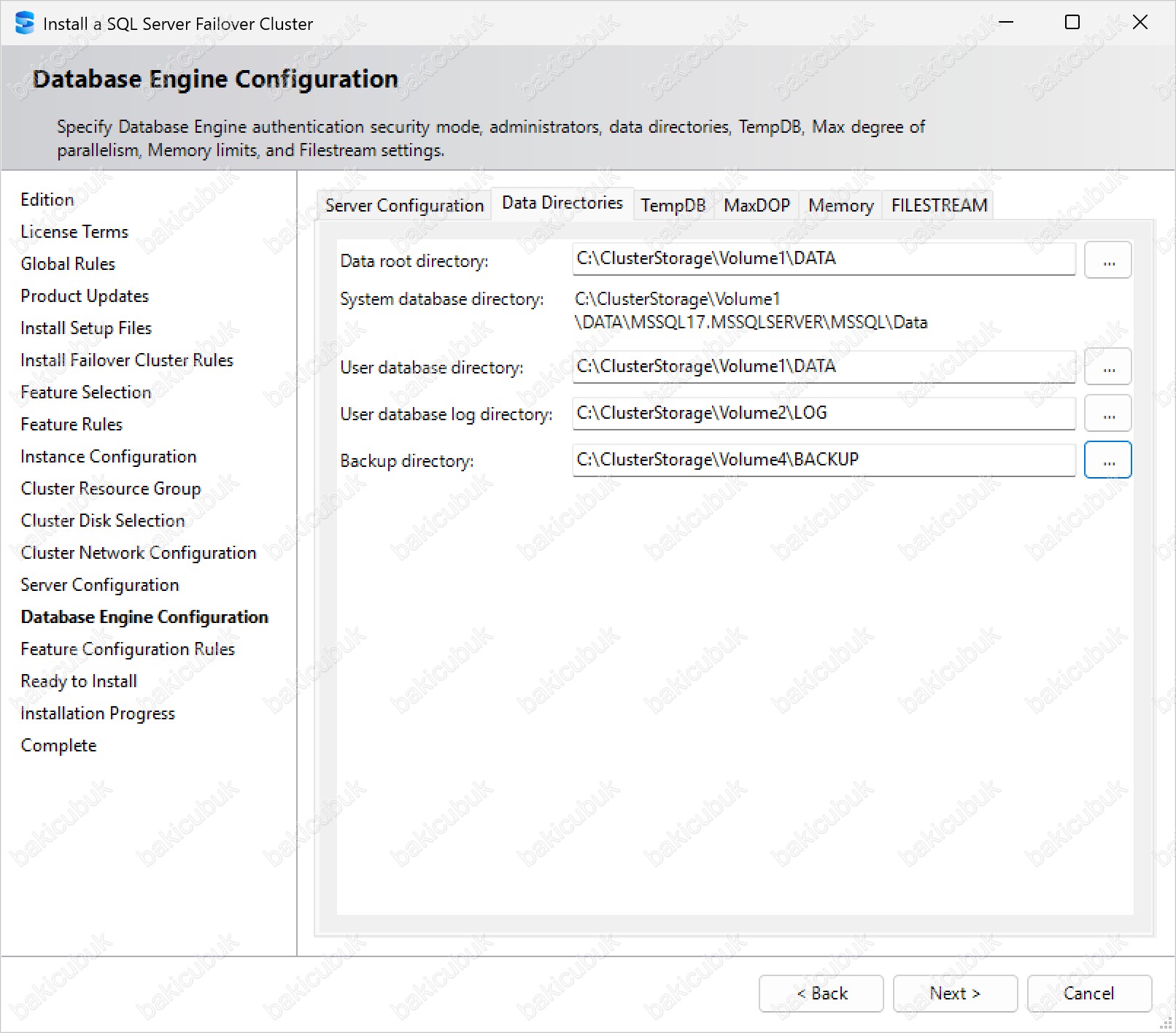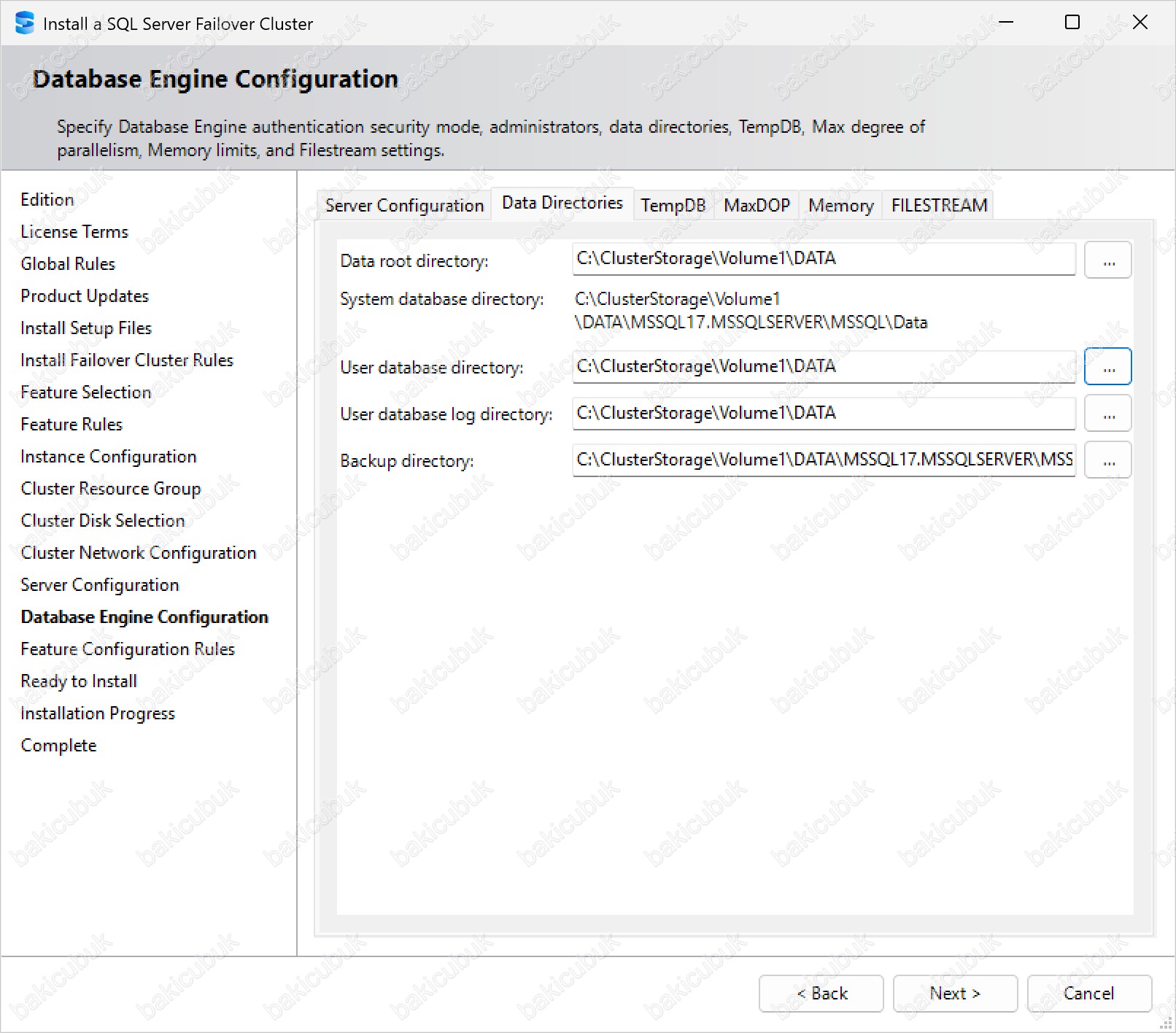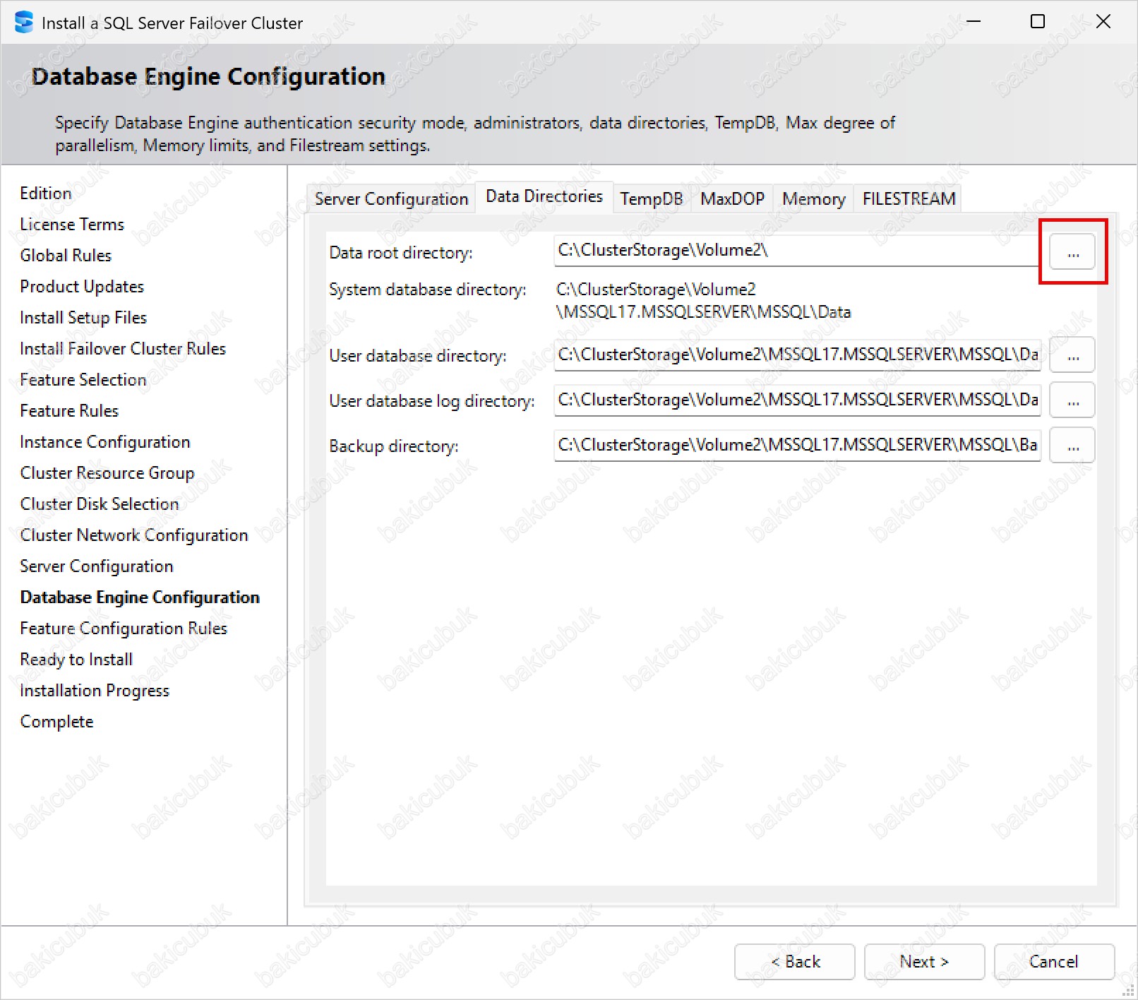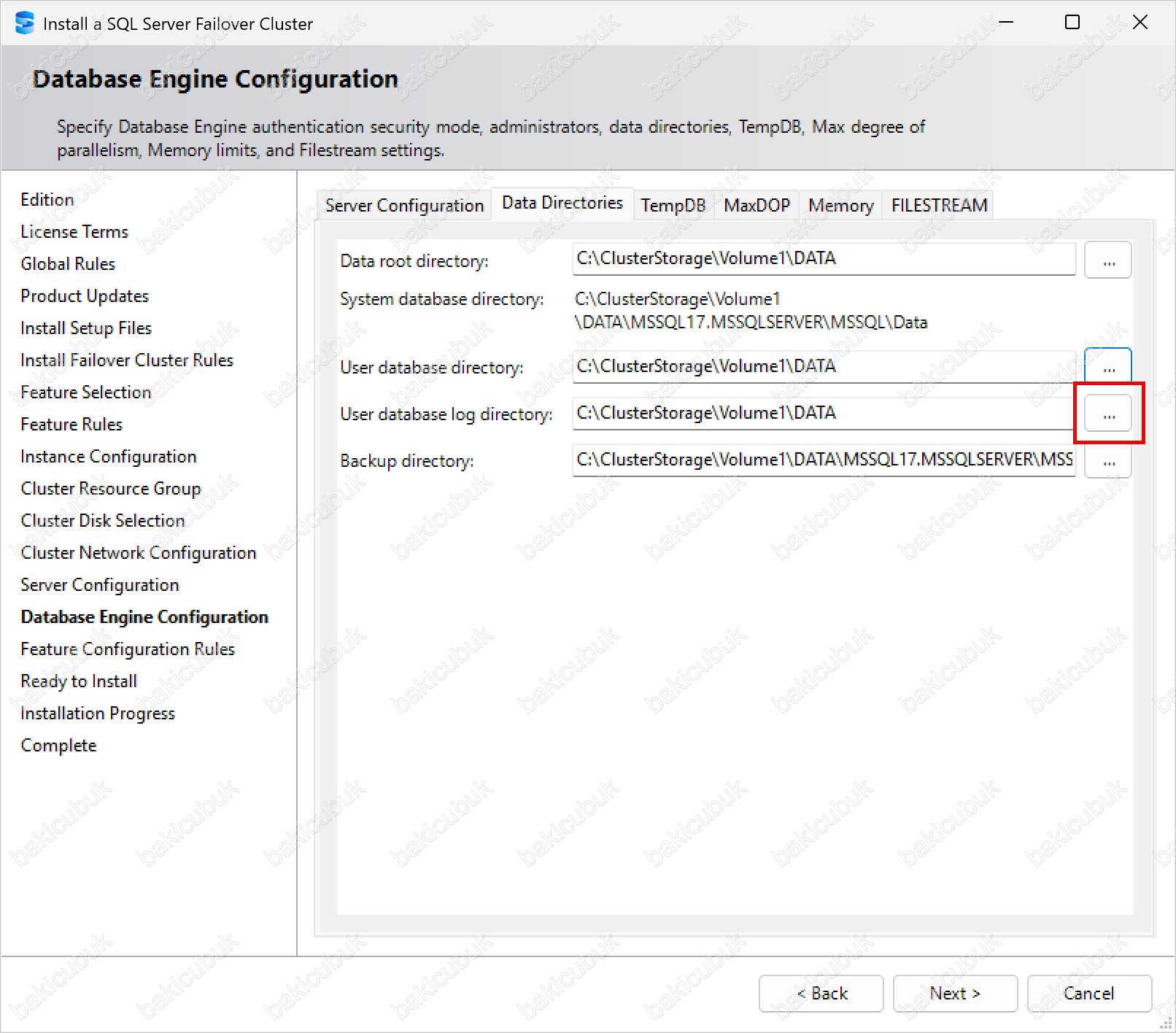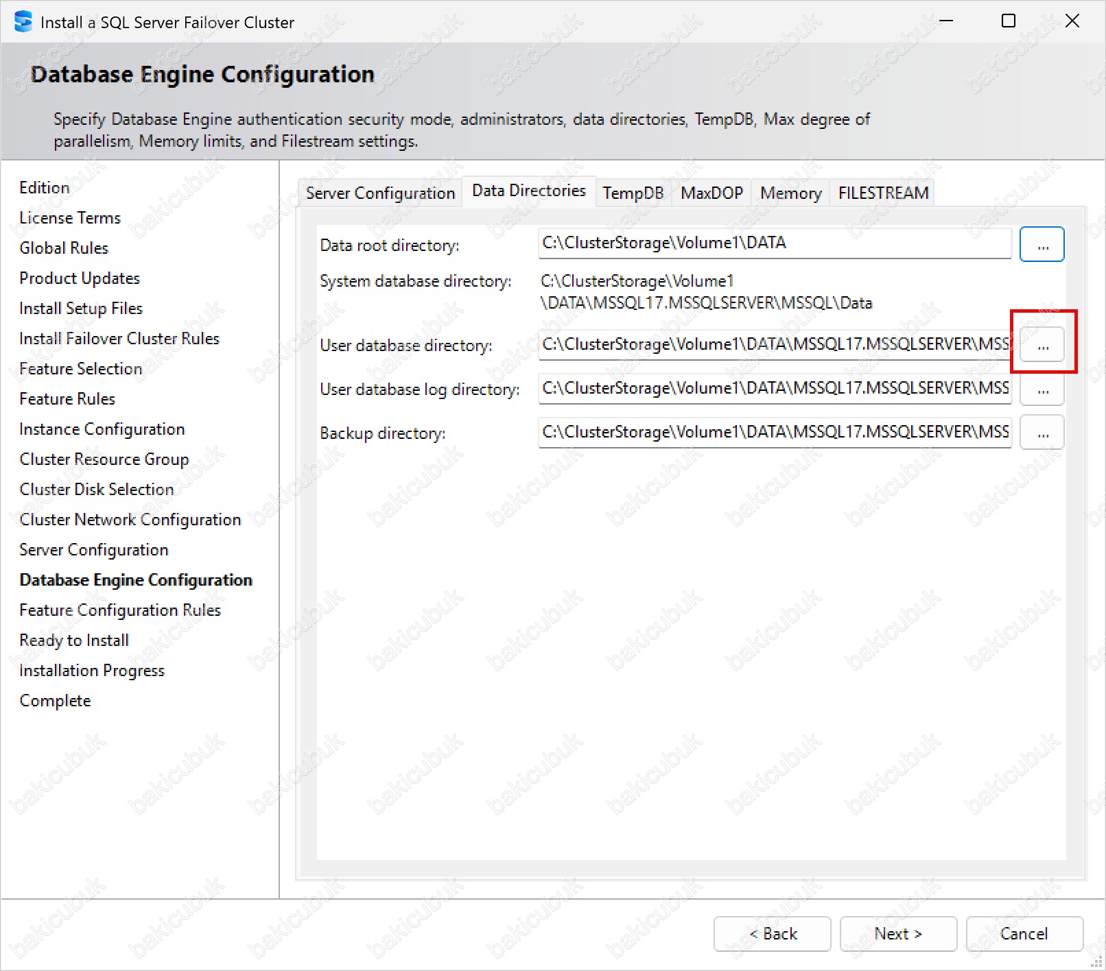 Database Engine Configuration ekranında yer alan TempDB sekmesindeki Data directories bölümüne ait dizin yapılandırmasını tamamlıyoruz. Bu adım ile TempDB veri dosyalarının Failover Cluster Instance (FCI) mimarisinde sunucu üzerinde hangi dizinde tutulacağı net olarak belirlenmiş olur ve SQL Server’ın geçici veri işlemleri için kullanacağı fiziksel disk konumu tanımlanır.