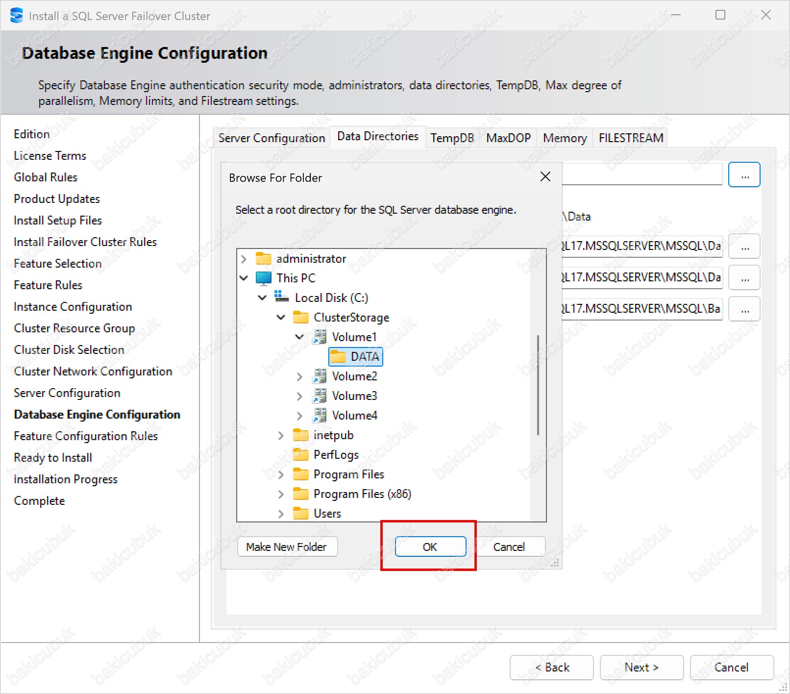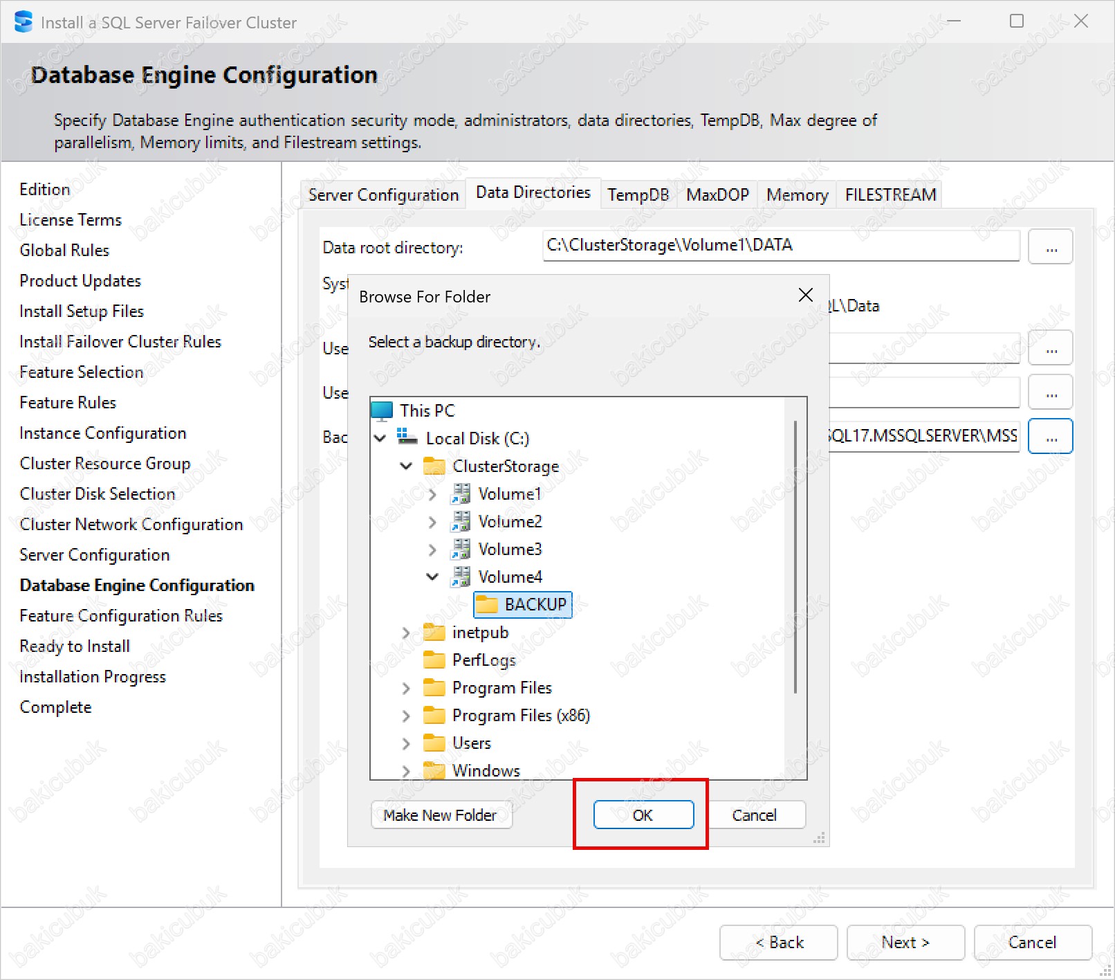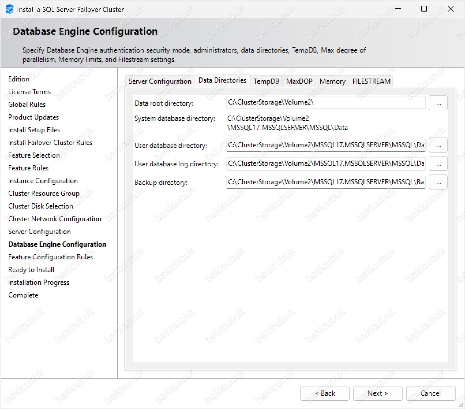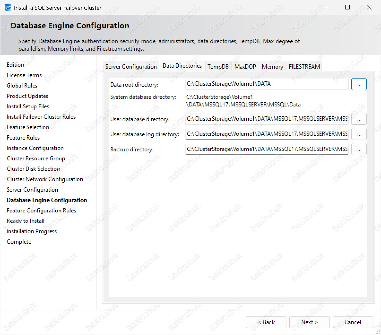 Database Engine Configuration ekranında yer alan TempDB sekmesindeki Data directories bölümüne ait dizin yapılandırmasını tamamlıyoruz. Bu adım ile TempDB veri dosyalarının Failover Cluster Instance (FCI) mimarisinde sunucu üzerinde hangi dizinde tutulacağı net olarak belirlenmiş olur ve SQL Server’ın geçici veri işlemleri için kullanacağı fiziksel disk konumu tanımlanır.