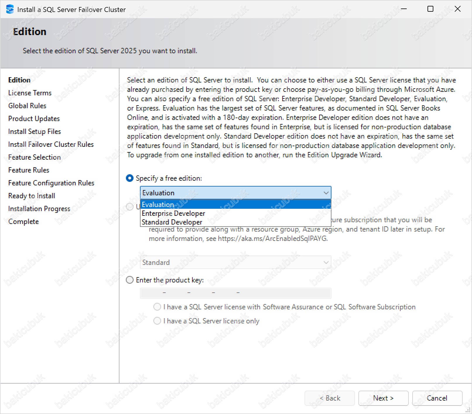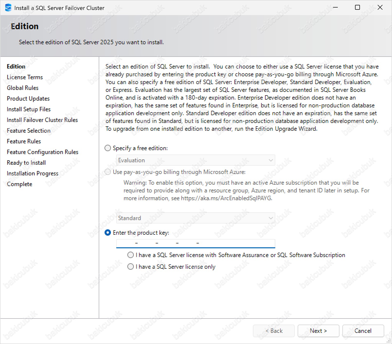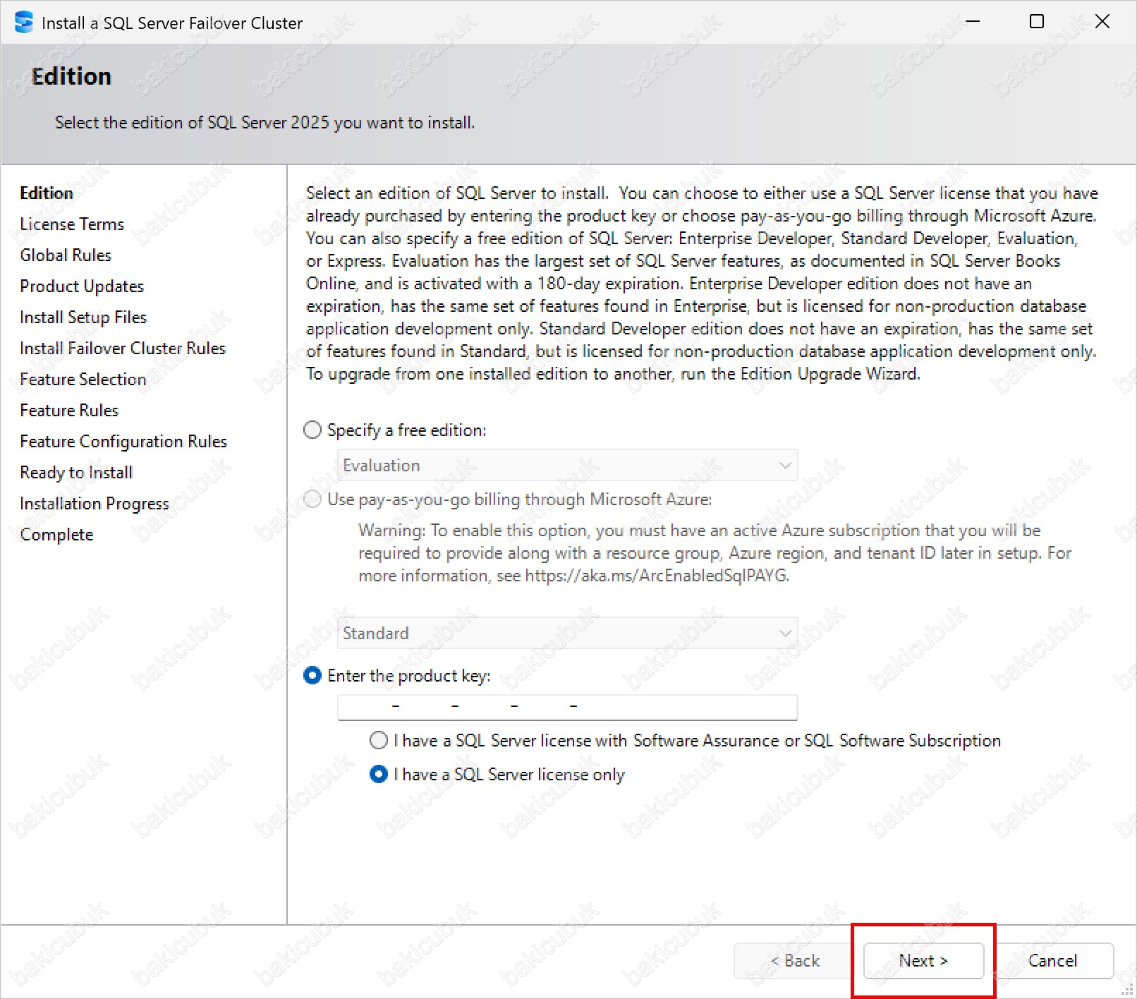 - I have a SQL Server license only: Daha önce Perpetual (Bağımsız) olarak satın alınmış bir Microsoft SQL Server 2025 lisansına sahip kullanıcılar için kullanılır. Kurulum sırasında ürün anahtarı manuel olarak girilerek lisanslama işlemi tamamlanır.