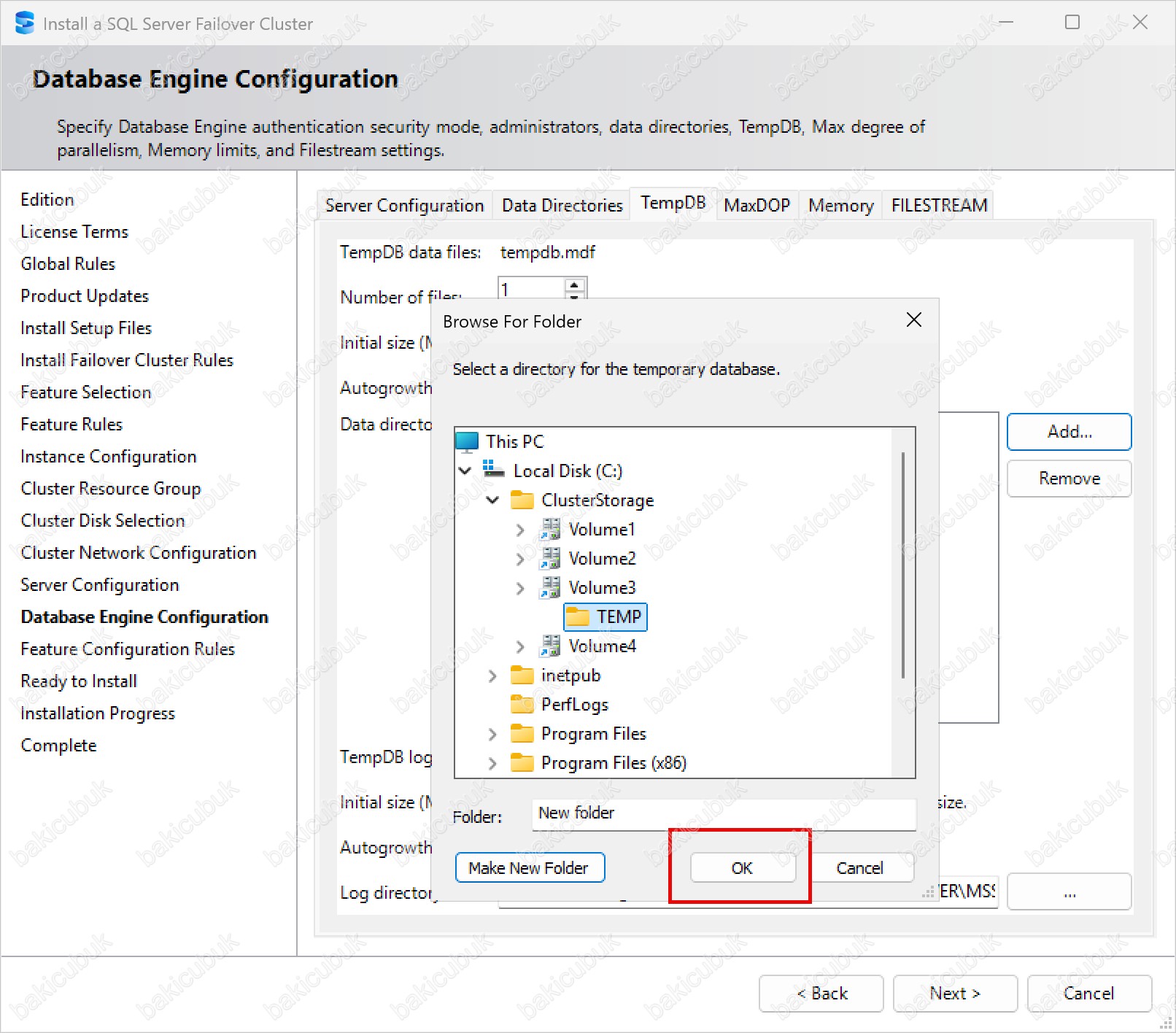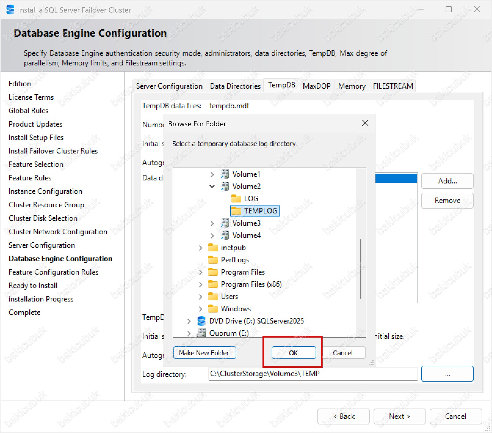 Browse For Folder ekranında, W25SQL25NOD1 isimli sunucumuz üzerinde daha önce Microsoft SQL Server 2025 Failover Cluster Instance (FCI) kapsamında yapılandırılmış olan disk birimlerini görüntülüyoruz. Bu aşamada TempDB’ye ait log dosyalarının tutulacağı disk olarak Cluster Disk 2 (LOG – C:\ClusterStorage\Volume2) birimini seçiyoruz. Seçtiğimiz Cluster Disk 2, Cluster Shared Volume (CSV) olarak yapılandırılmış olup tüm node’lar tarafından ortak şekilde erişilebilen Cluster Shared Volume (CSV) alanıdır.