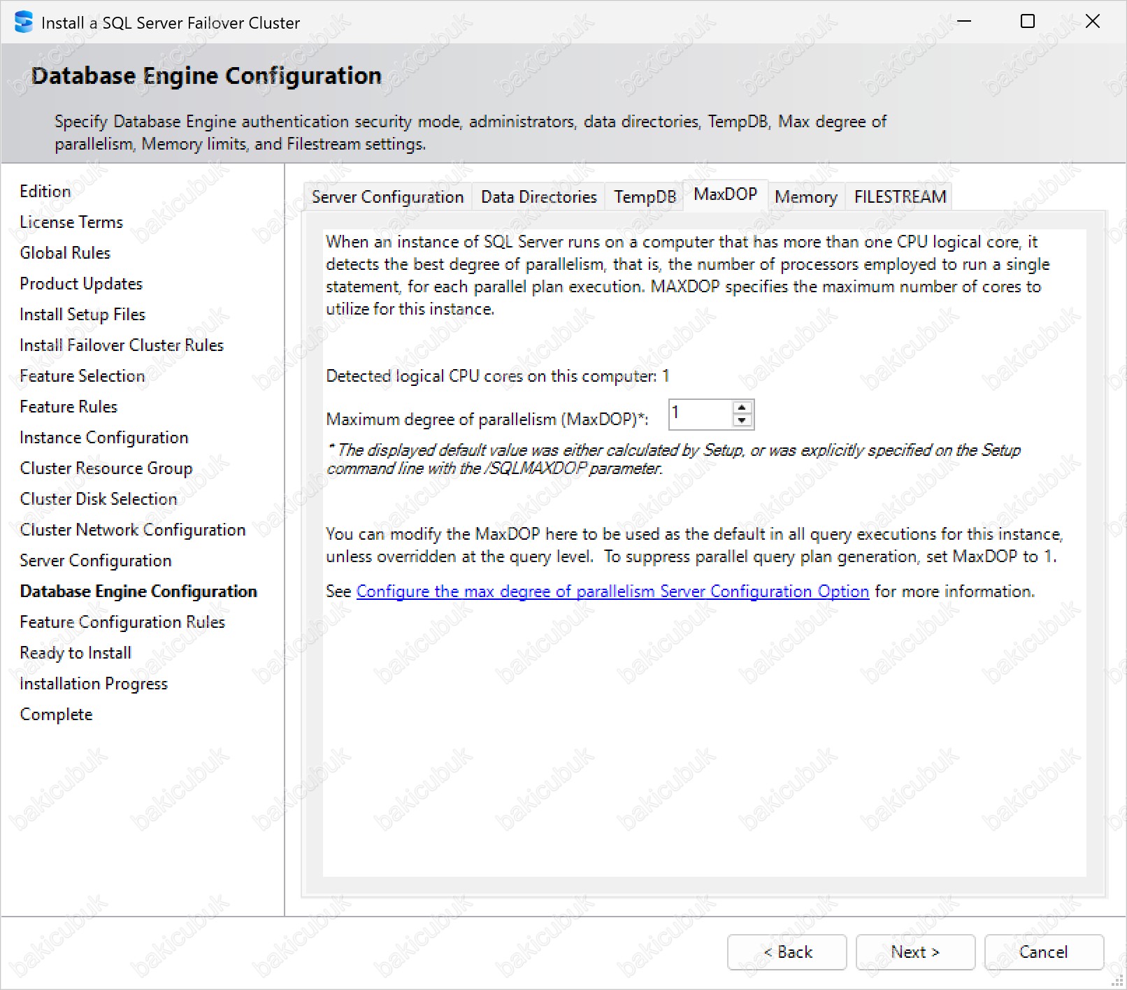 Database Engine Configuration ekranında TempDB sekmesinde TempDB ve TempDB Log dizin yapılandırmalarını tamamladıktan sonra, Microsoft SQL Server 2025 kurulum sürecinin bir sonraki adımı olan MaxDOP yapılandırmasına geçiyoruz. MaxDOP (Maximum Degree of Parallelism), SQL Server’ın sorguları kaç çekirdek kullanarak paralel çalıştıracağını belirleyen önemli bir performans parametresidir ve özellikle CPU yoğun iş yüklerinde doğru yapılandırılması önerilir.