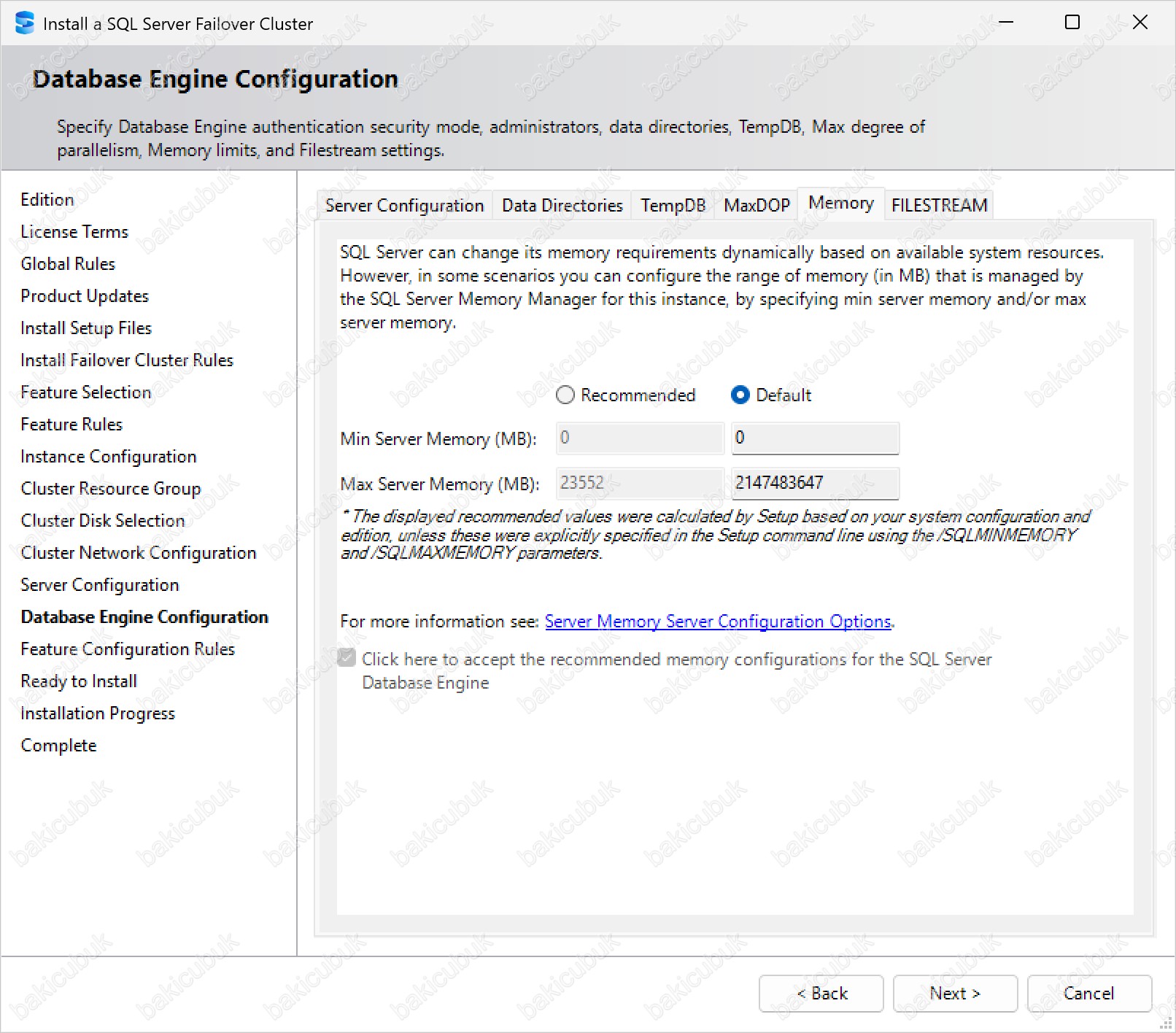 Database Engine Configuration ekranında bulunan Recommended, Default, Minimum Server Memory ve Maximum Server Memory ayarları, Microsoft SQL Server 2025’in RAM kullanım davranışını kontrol eden temel parametrelerdir ve bellek yönetiminin nasıl şekilleneceğini belirler.