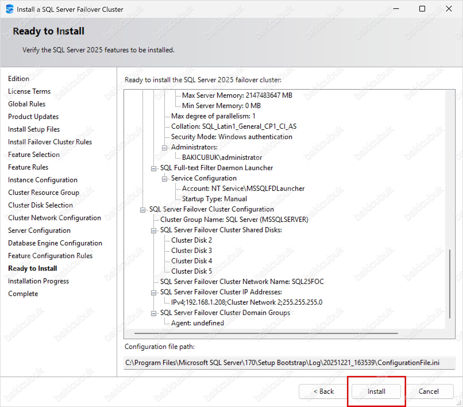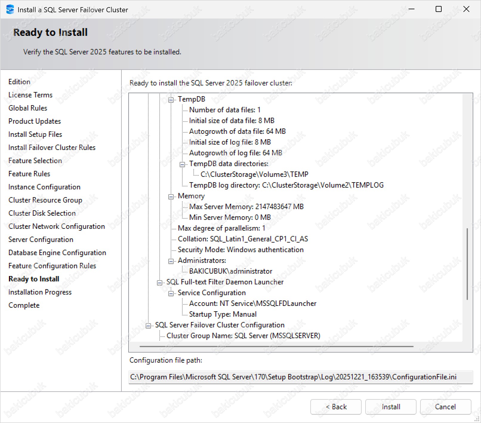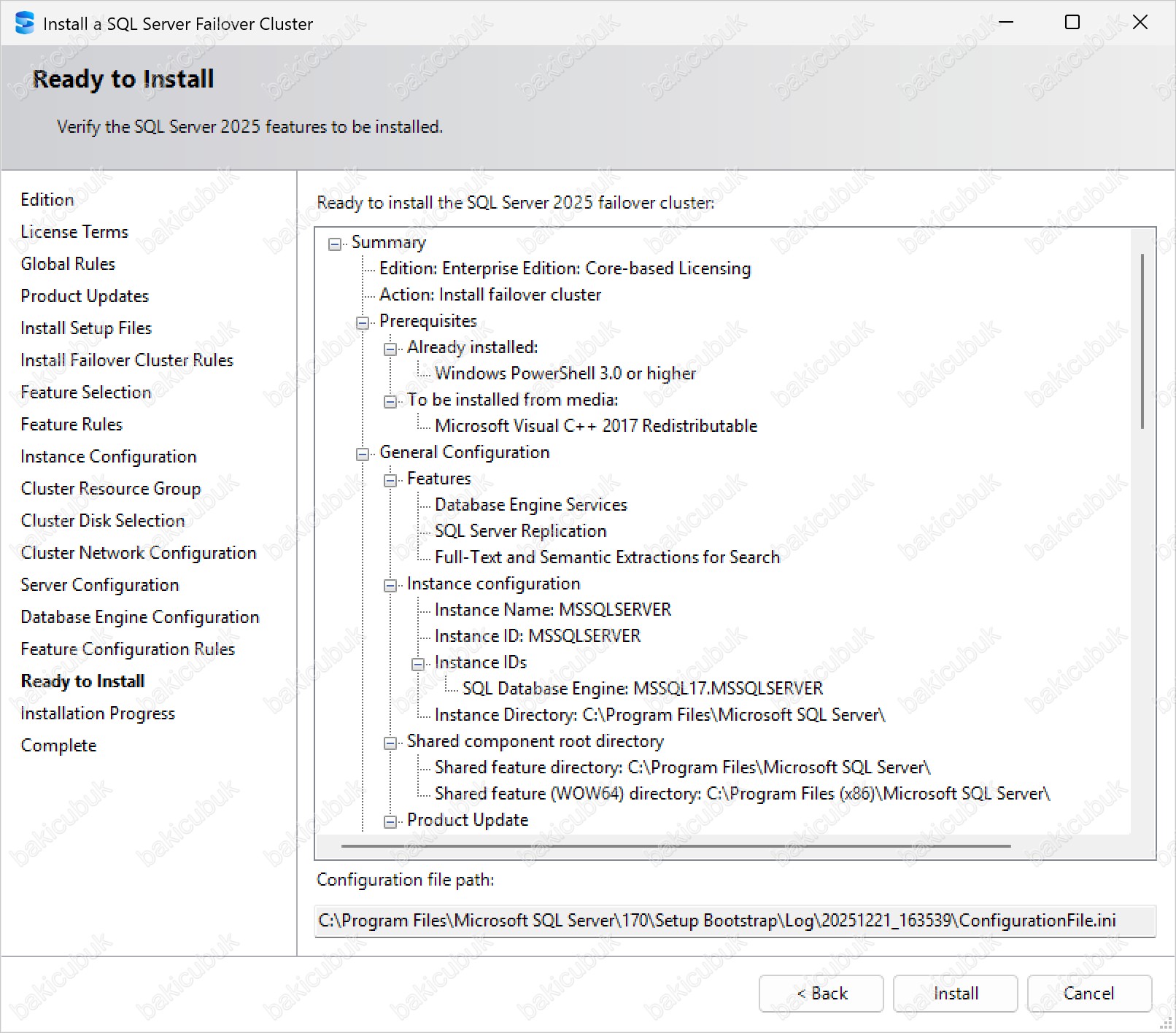 Ready to Install ekranında Microsoft SQL Server 2025 kurulumu boyunca gerçekleştirdiğiniz tüm yapılandırma adımlarının özet bilgisi görüntülenir. Microsoft SQL Server 2025 Failover Cluster Instance (FCI) mimarisine uygun bir kurulum gerçekleştirirken bu ekran, sürecin en kritik doğrulama noktalarından biri olarak değerlendirilmelidir. Çünkü kurulum sırasında seçmiş olduğunuz tüm bileşenlerin, dizin ayarlarının ve servis yapılandırmalarının sistem tarafından doğru şekilde algılanıp algılanmadığını bu ekranda toplu ve net bir şekilde görme imkanı elde edersiniz.