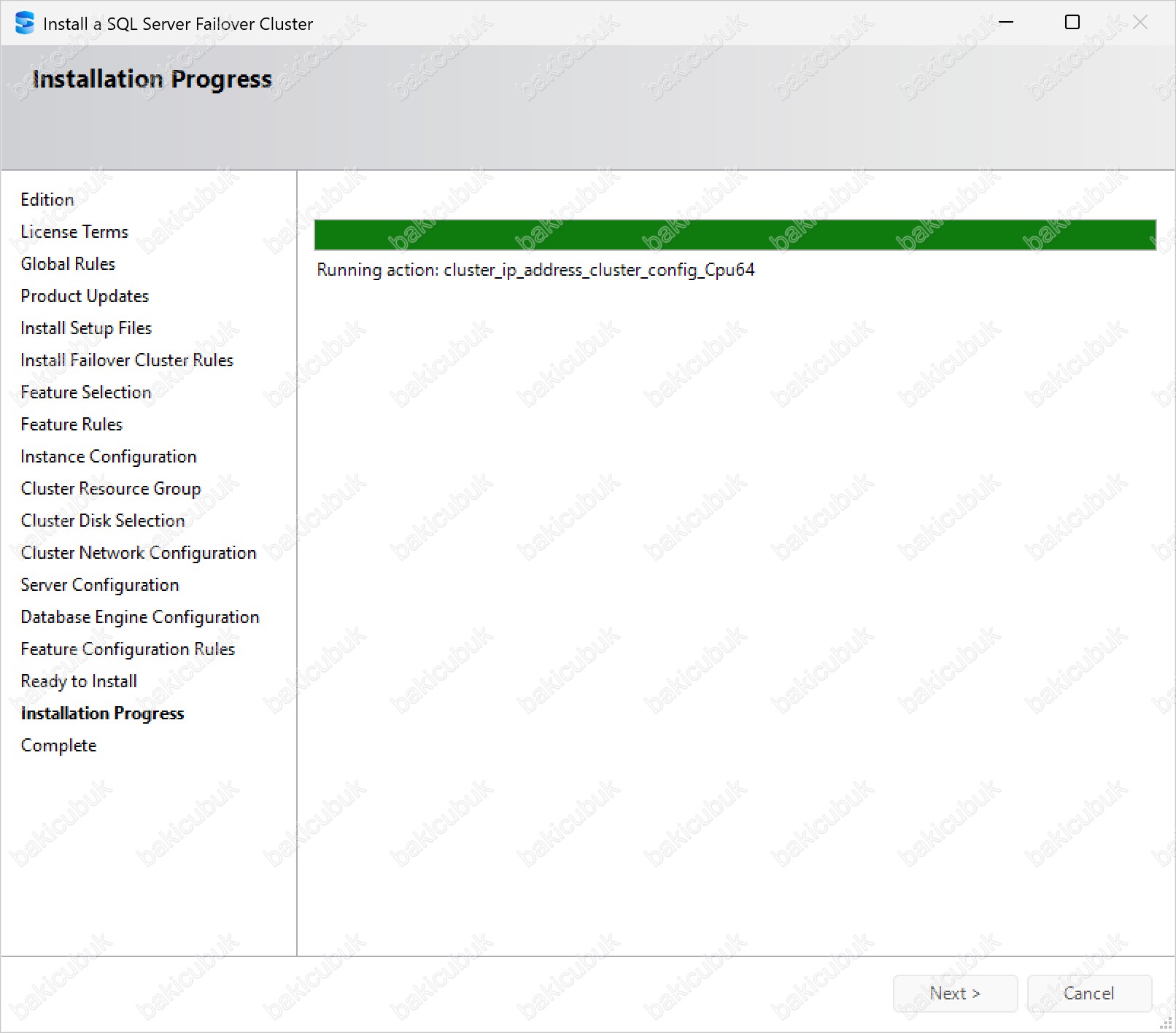 Kurulumun bu adımı, yapılandırma sürecinin fiilen hayata geçirildiği noktadır. İşlem tamamlandığında, Microsoft SQL Server 2025 instance’ı SQL Server Failover Cluster Instance (FCI) mimarisi için hazır hale gelir ve bir sonraki aşamada kurulumun başarıyla tamamlandığının doğrulanacağı Installation Progress ve Complete ekranlarına geçilir.