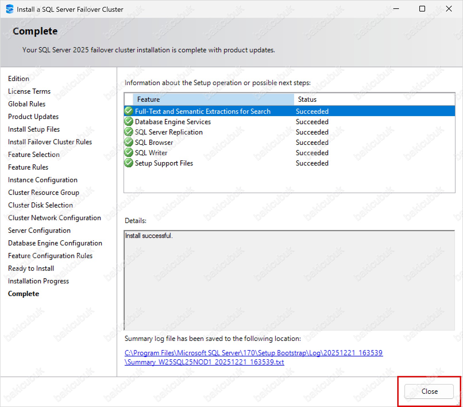 Kurulum başarıyla tamamlandıktan sonra Close seçeneğine tıklayarak SQL Server 2025 Setup ekranını kapatıyoruz. Bu aşama ile Microsoft SQL Server 2025 kurulumu başarıyla tamamlanmış olur.
